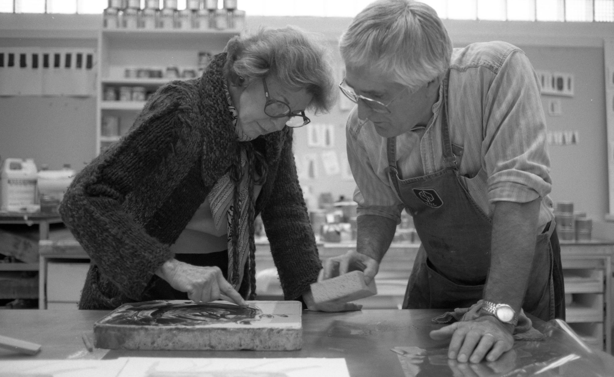 Helen Frankenthaler, assisted by Kenneth Tyler, reworking the image on a lithography stone used in proofs for Reflections XII, from the Reflections series, Tyler Graphics, Mount Kisco, New York, in February 1995. National Gallery of Australia, Kamberri/Canberra, Gift of Kenneth Tyler 2002. Photo: Marabeth Cohen-Tyler