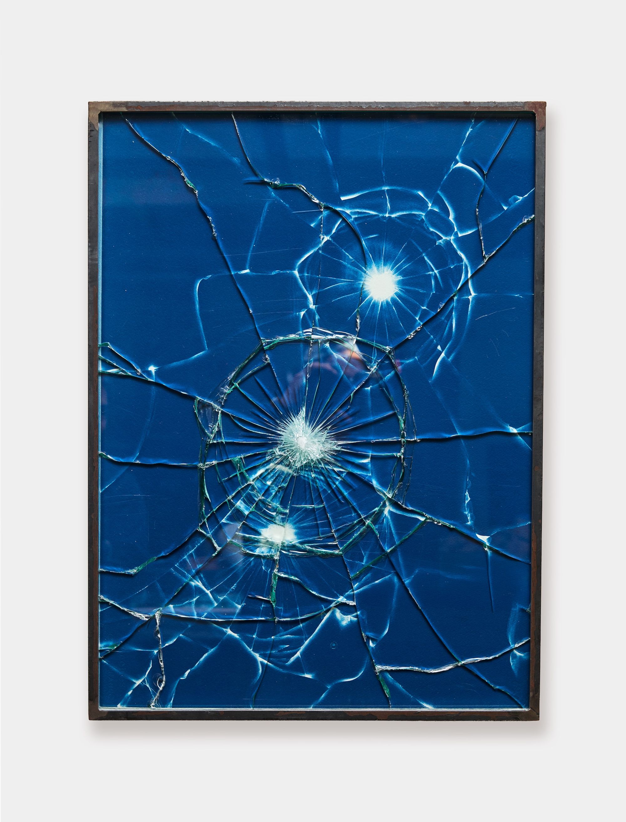 In their exhibition, Wright and Millares reflect on this experience, shared by new migrants and the around one million Cubans exiled after the 1959 revolution. The exhibition is charged with both violence and a sense of the uncanny. It includes Wright’s cyanotypes under smashed glass, which evoke brutality and fragility in a single, visceral gesture. Works from Millares’s Paint by Number series are also on view, in which the artist takes numbers from financial documents and transforms them into silkscreen prints, akin to reducing people to a series of jumbled numbers on a canvas. The salvaged boat sculpture, Exile, is installed in a darkened room with a warm, hazy light shining out of the bullet holes and embedded speakers playing sounds that register as vibrations before they are heard.