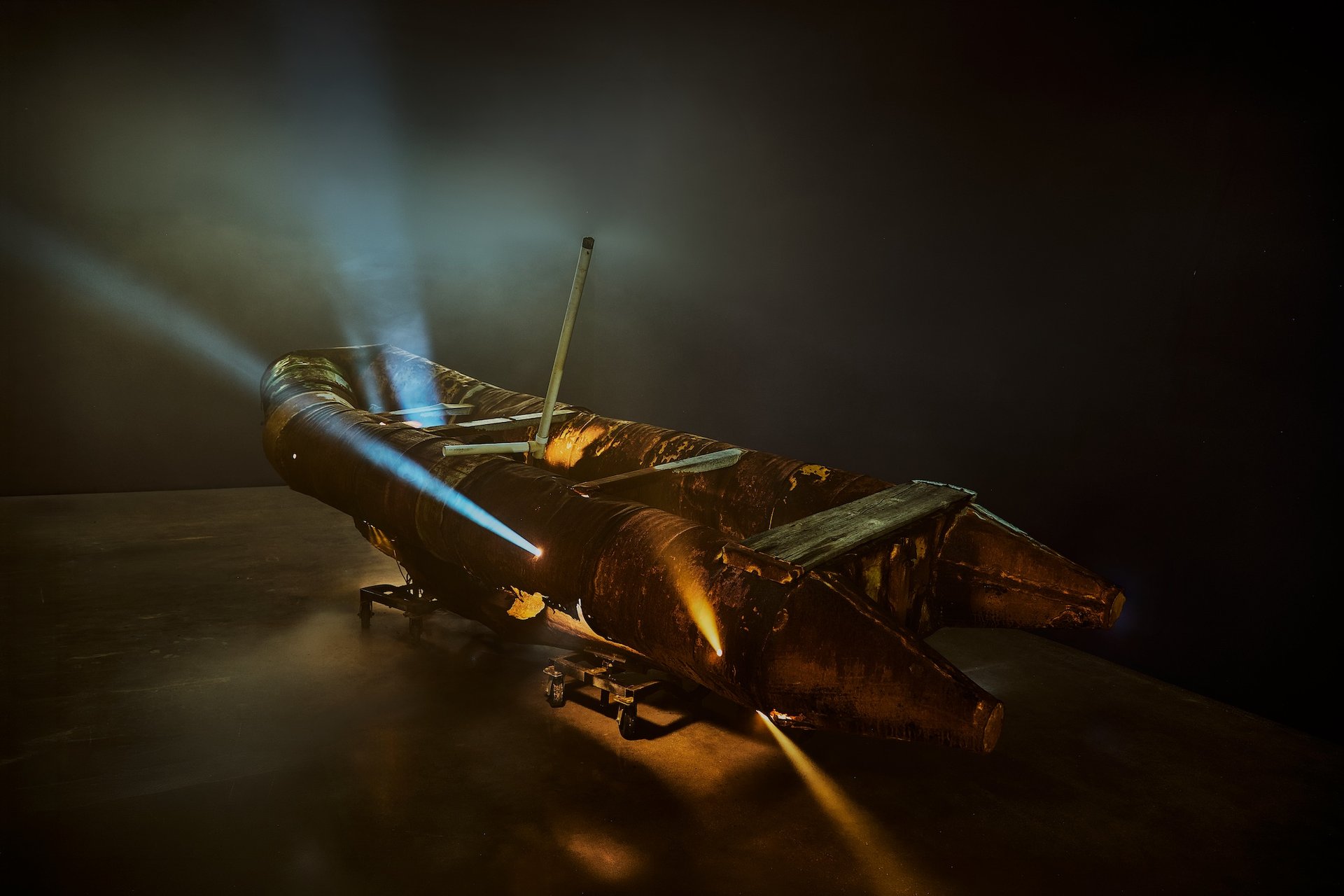 Until recently, a large, rusted vessel hung from a steel beam in the Miami studio of artists Antonia Wright and Ruben Millares. The craft is made of steel barrels welded together, with two cone-like drums topping either side. In the centre, an oxidised engine is connected with makeshift wires; four wooden planks span the raft’s barrels, providing structure and seating. Two bullet holes are visible in the wreckage, as are signs of human life: the word “Mami” is scrawled on the vessel, as is a small child-like sketch of a boat.