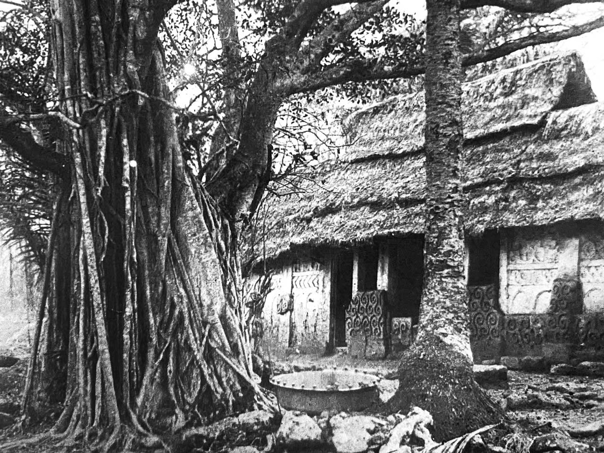 In 1817, a British visitor to the Asante kingdom’s capital of Kumasi, Thomas Bowditch, saw the Aya Kese in the royal mausoleum complex at Bantama, just outside the city. He wrote about “the largest brass pan I ever saw (for sacrifices), being about five feet in diameter, with four small lions on the edge”. Bowditch then commented that “human sacrifices are frequent and ordinary, to water the graves of the kings”. The basin was photographed as early as 1884 in front of the mausoleum’s entrance, placed beneath a pair of trees.