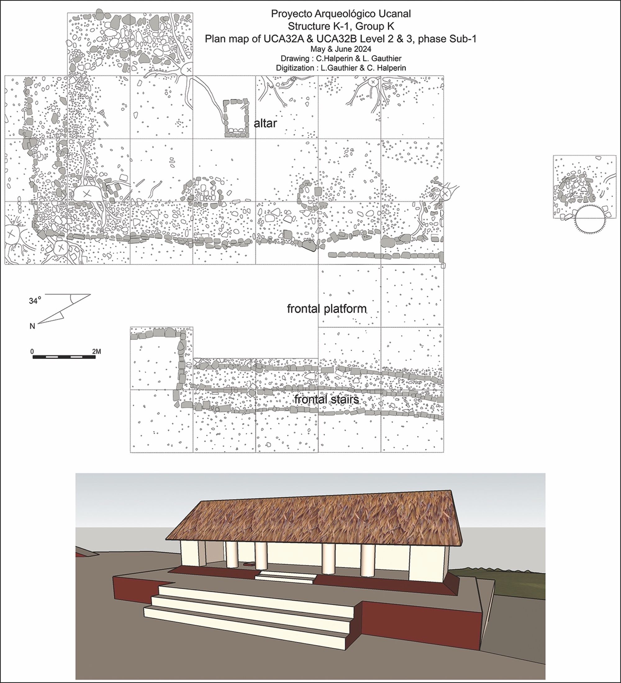 Site drawing and 3D rendering of the open, colonnaded council building at Ucanal Drawing: Christina T. Halperin and Laurianne Gauthier. Rendering: M. Voltaire