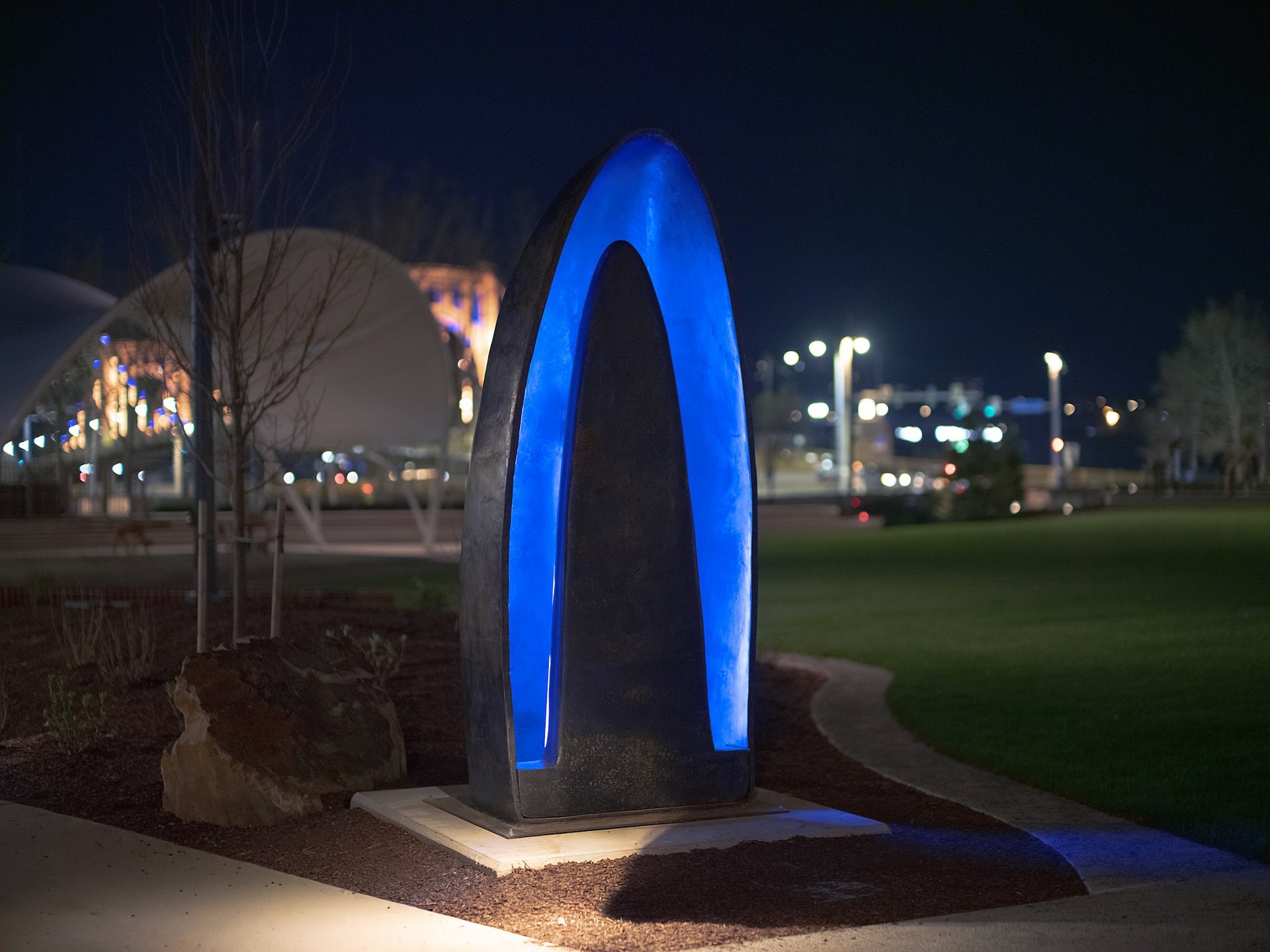 Shikeith’s Hold, located on the project's southern end, is one of the most dynamic pieces in Arts Landing. While many public works tend to be static, Hold uses neon light to create an ever-changing, pulsating image that flickers and dims with night and day. The piece is part of Shikeith’s ongoing Project Blue Space, exploring the role of the colour (and water) in Black American life—the Middle Passage, blues music, the “haint blue” of Gullah Geechee folk tradition. Ghosts cannot cross water, so many homes in the American South have haint-blue doorways.