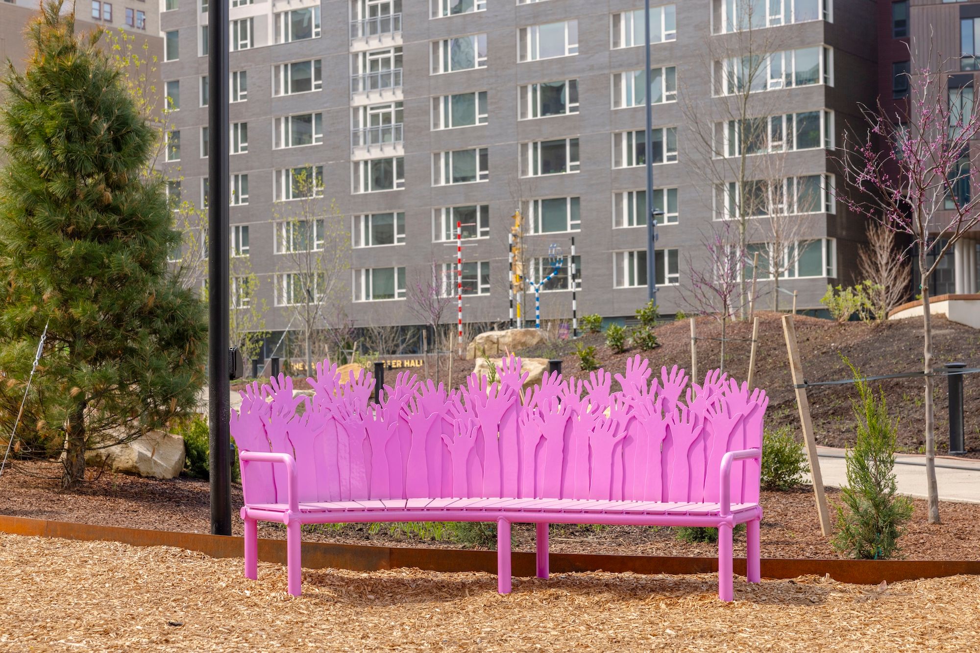 vanessa german’s Lifted, which takes the form of benches made of sculptural hands based on local centegenerians’ tracings, is part of the playground space. “I hope that as people take a seat, supported by the hands of some of the eldest Pittsburgh residents,” german says, “they feel connected to a long line of people whose lives, ideas, labour and dreams built the city around them. A lot of public art happens at such a distance from the public. These benches are the public—the citizen, the life, the hand as a public work of art.”