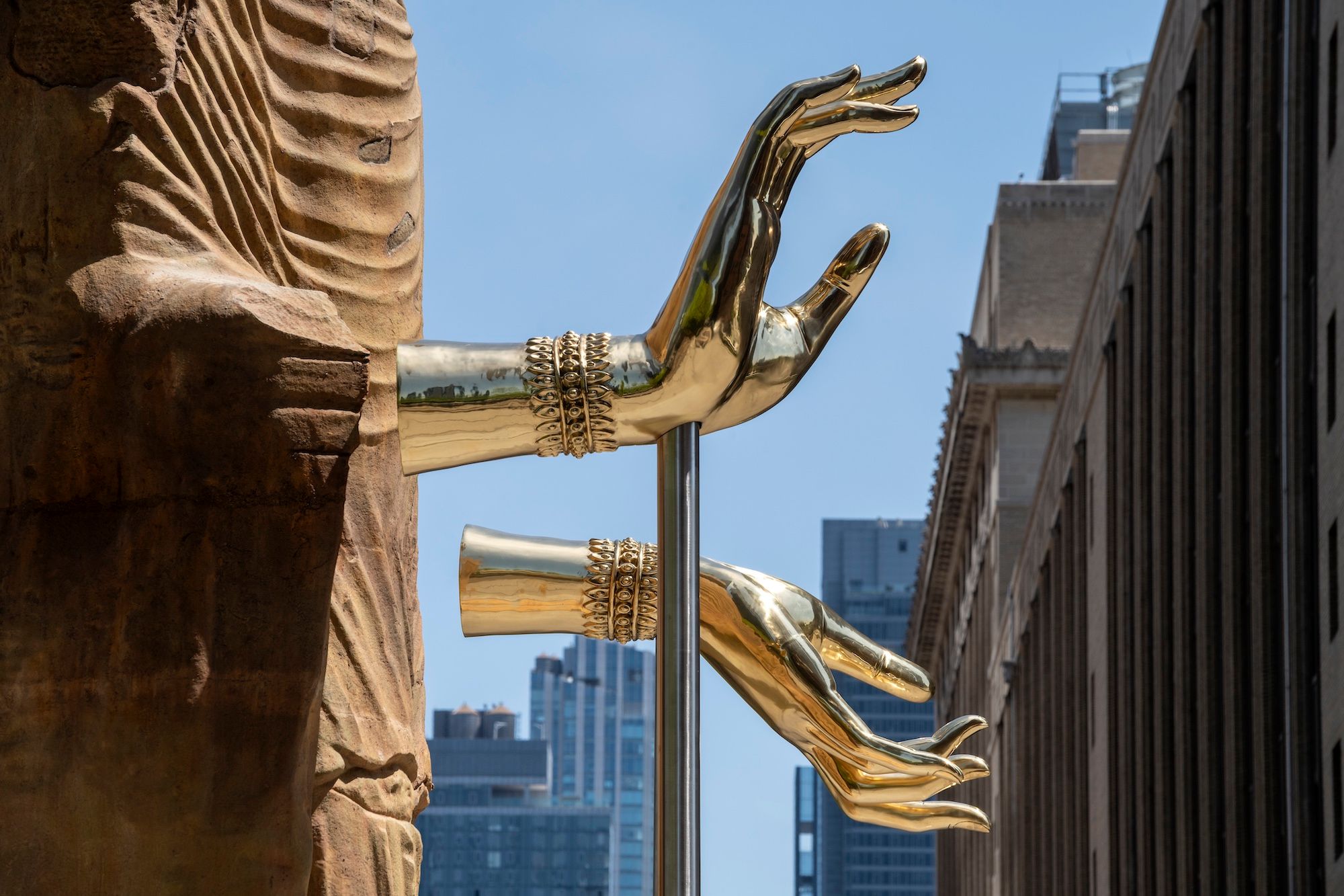 His sculpture is not an exact replica of either of the Bamiyan Buddhas, but is largely made of the same material: carved sandstone. The Buddhas’ hands were destroyed centuries ago in an earlier act of iconoclasm; Nguyen has created two monumental steel hands that float slightly away from the sandstone limbs, supported by tall rods. They make gestures symbolising fearlessness and compassion, and are cast from melted-down artillery shells sourced from Afghanistan—a process connected to Nguyen’s practice of turning unexploded ordinances from the Vietnam war into vessels of memory and healing.