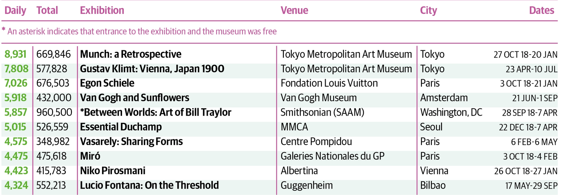 This list regularly reflects museum goers’ appetite for paying to see male artists at the heart of the art-historical canon: only one of the top ten shows was free, and the names are mostly the usual suspects, including the ubiquitous Edvard Munch and Vincent van Gogh. Indeed, you have to go down to the 13th most popular show in this category to find a woman artist, the Brazilian Tarsila do Amaral. And despite the acclaim and surprise at its success, the Solomon R. Guggenheim’s Hilma af Klint exhibition only comes in 18th, though it did have the sixth most visitors overall (663,849 in total; 3,458 daily). But there are some surprises in the top ten: two self-taught artists, the African American painter Bill Traylor, and the Georgian folk artist Niko Pirosmani. It is notable that figurative art appears to win over abstraction: Munch, Gustav Klimt, Egon Schiele, Van Gogh and Traynor form the top five, with Vasarely, Joan Miró and Lucio Fontana below them.