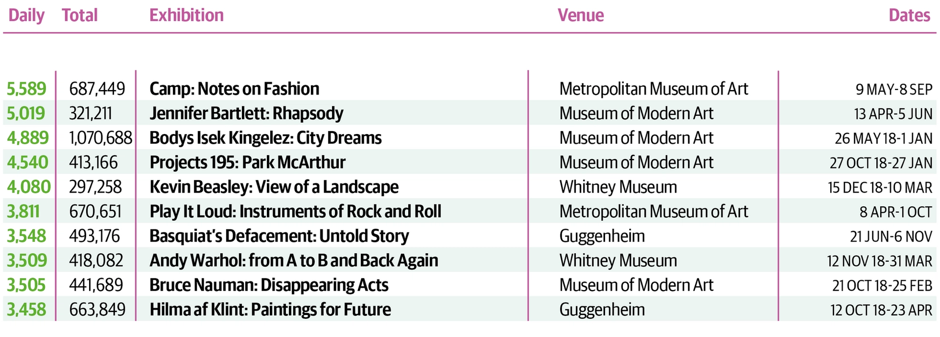 New York’s Metropolitan Museum of Art tops the Big Apple's list for the second year running, with an exhibition exploring the aesthetics of “camp”. However, the total failed to beat last year’s Heavenly Bodies, which hit the, err, heavenly heights of 10,919 visitors a day. Beyond that, it seems New Yorkers are embracing “America first”, as six of the top ten solo shows are of US artists. But despite the presence of some big hitters—Basquiat, Warhol, Nauman—it was the lesser-known Jennifer Bartlett, Park McArthur and Kevin Beasley shows that attracted the most people. A notable mention should also go the Congolese artist Bodys Isek Kingelez, whose miniature cities made from paper were a hit at the Museum of Modern Art.
