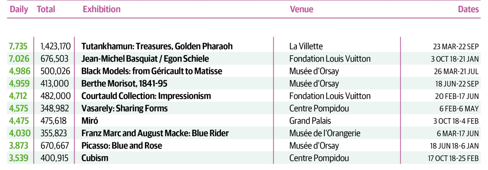 In Paris, a touring Tutankhamun exhibition pipped the concurrent solo shows of Jean-Michel Basquiat and Egon Schiele at the Fondation Louis Vuitton to the top spot. King Tut is always popular, as are the Impressionists, as seen here with Berthe Morisot and a selection from the Courtauld. Interestingly, these were topped by a thematic exhibition exploring depictions of black people in 19th- and early 20th-century Western art. The show began as a doctoral dissertation inspired by a lecturer ignoring the black maid when speaking about Edouard Manet’s Olympia (1863).