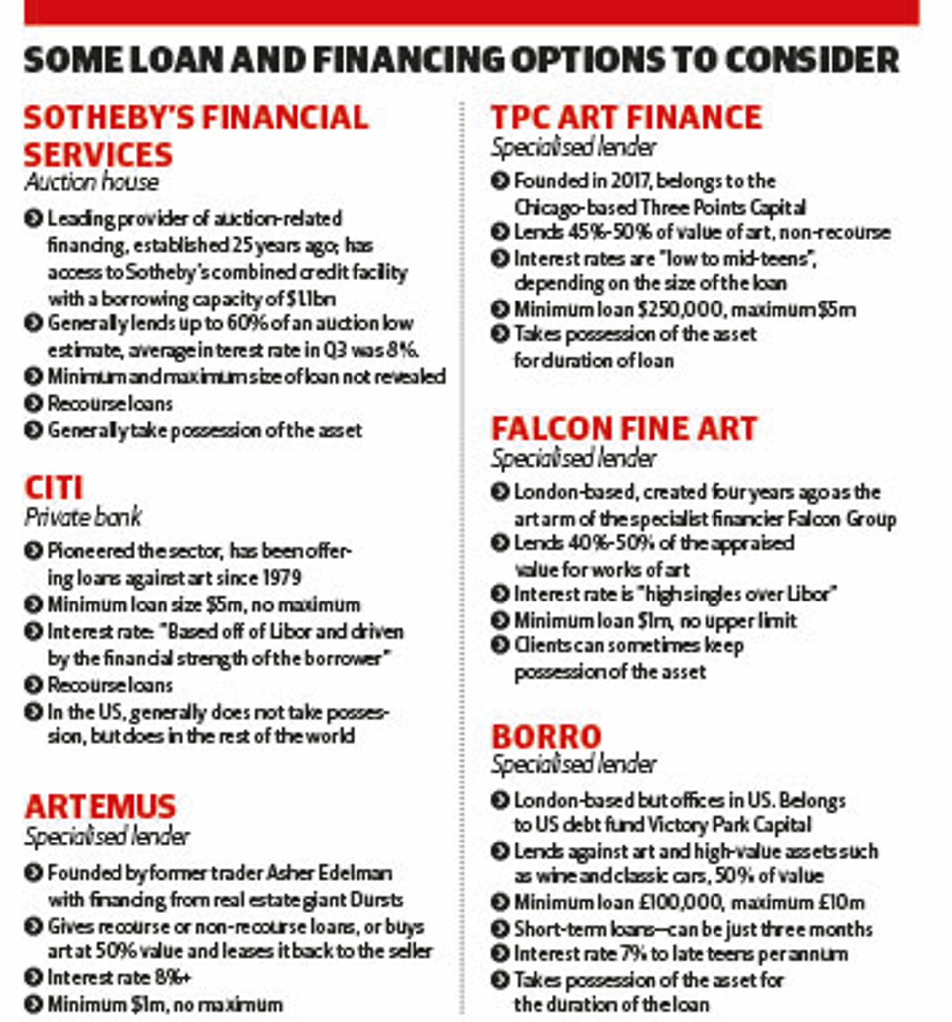 Then there are the specialised lenders, who are likely to charge interest in the upper single figures; some, such as TPC, Falcon Fine Art, are the lending arm of a bank or finance company. “Non-banks” such as Sotheby’s will lend up to 60% of the low auction value at around 8% interest, but generally will do so against future consignment of the work(s) for sale.