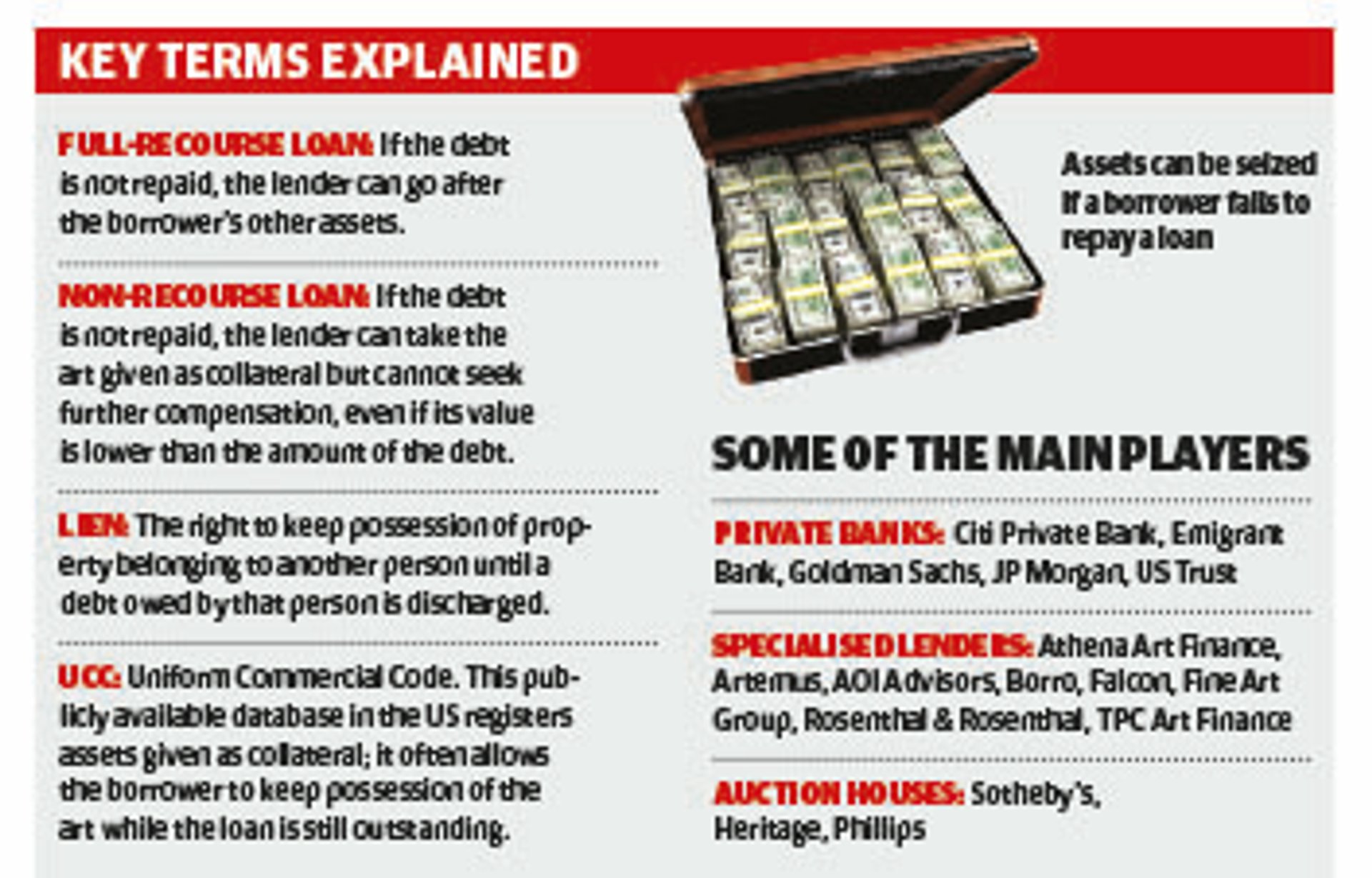 The biggest loan books are held by private banks, such as US Trust, with departments servicing their clients by giving recourse loans against their art holdings. But for others, there are specialist boutique lenders offering both recourse and non-recourse loans, and here is where there are a number of newcomers in the field: the London-based Fine Art Group moved into this area two years ago, TPC Art Finance just one year ago. The auction houses are also more than willing to lend against art and the main player, Sotheby’s, has a $1.1bn war chest with which to do so.