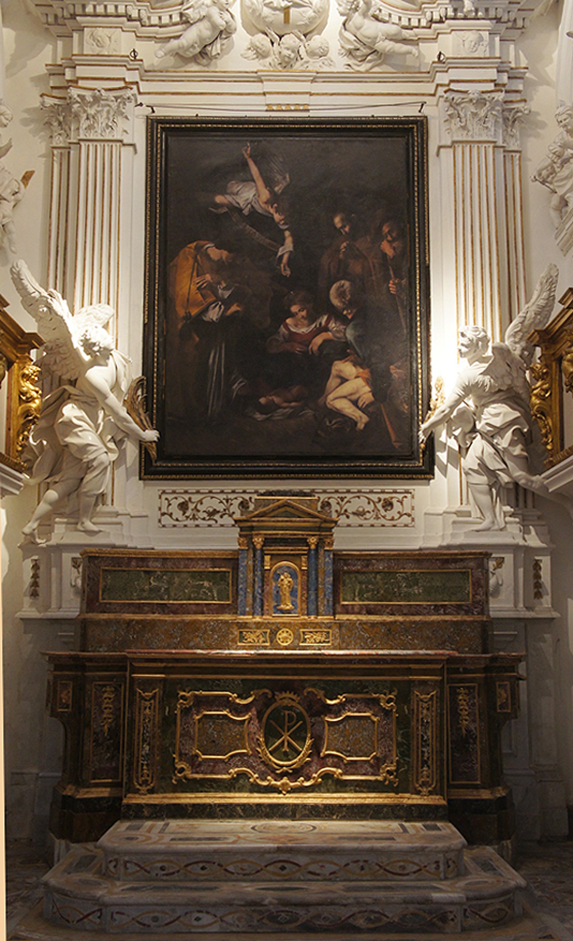 The recreation of the Caravaggio Nativity made by Factum Arte for the Oratory of San Lorenzo and put in place of the missing picture in 2016. It is based on the only colour photograph of the original, black and white images of it, and minute study of the paintwork of actual works by Caravaggio © Factum Arte