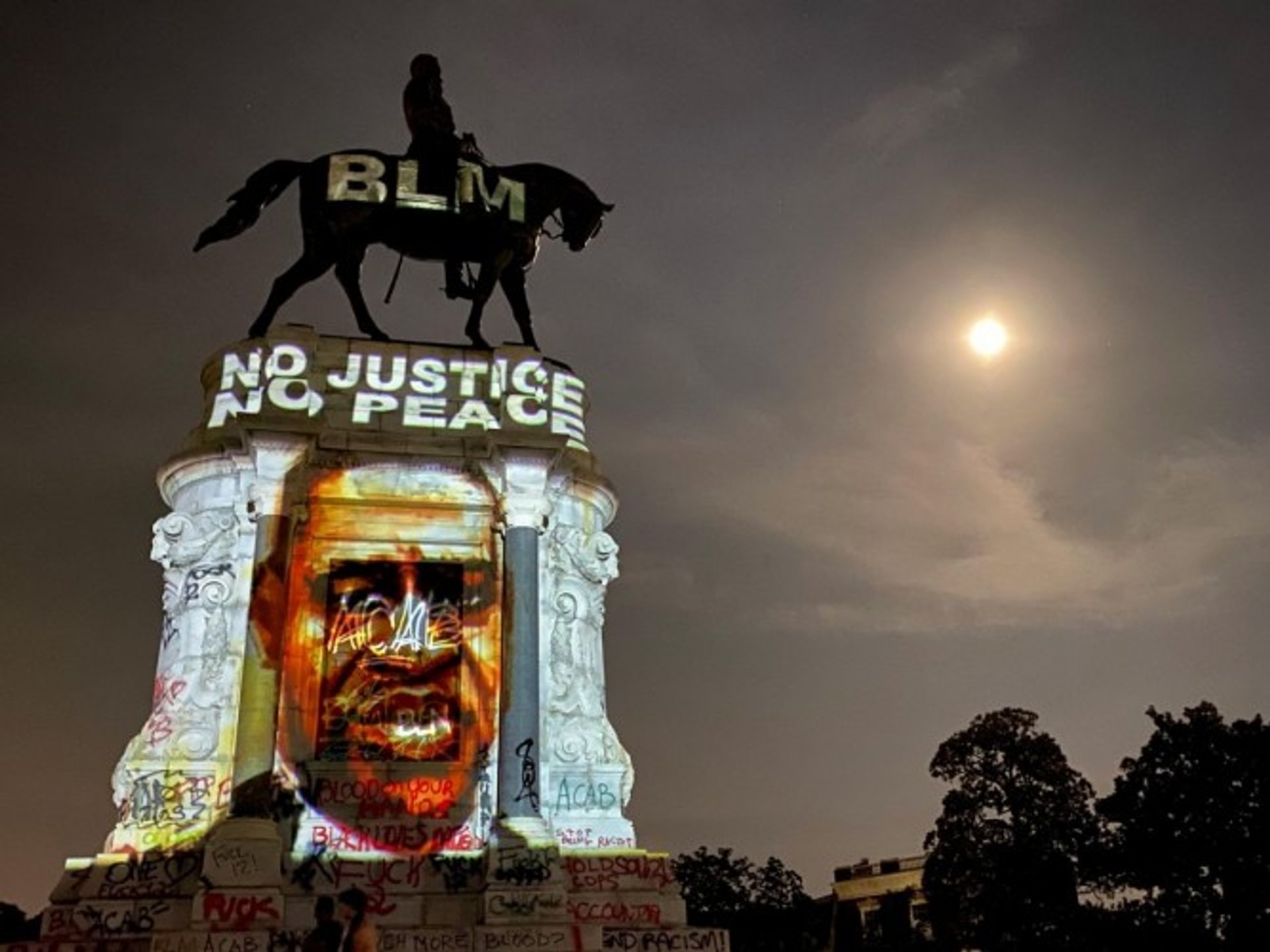 A Black Lives Matter tribute to the late George Floyd is projected onto the gratified statue of Confederate General Robert E. Lee in Richmond, Virginia. Photo by Wendy Goodman Humble/VPM News