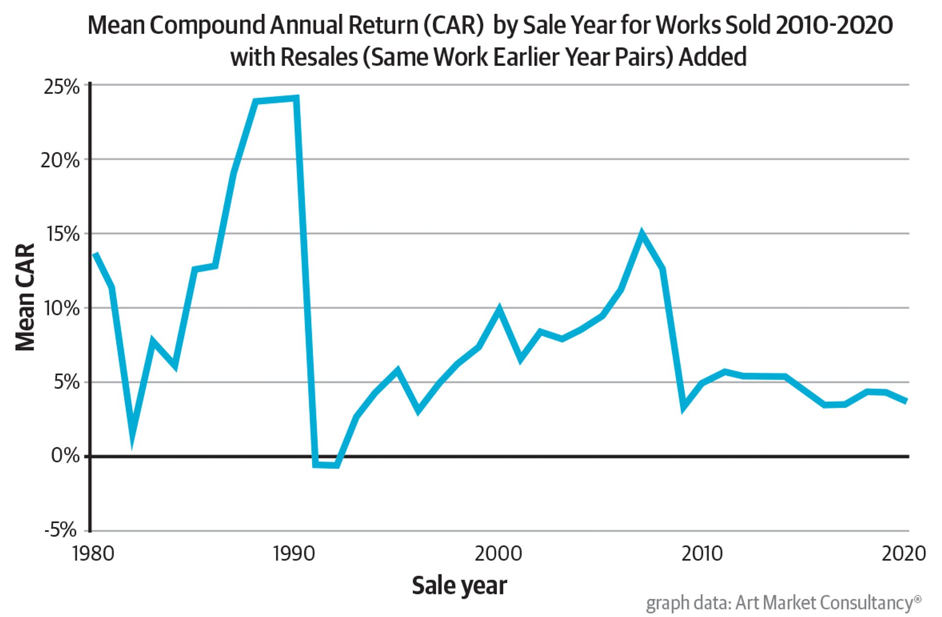 Average compound annual return (CAR) is a way of measuring the overall performance of the auction market over time. A major boom in the late 1980s and a lesser one in late 2000s has given way to a flatlining of the market since 2010. Source: ARTBnk