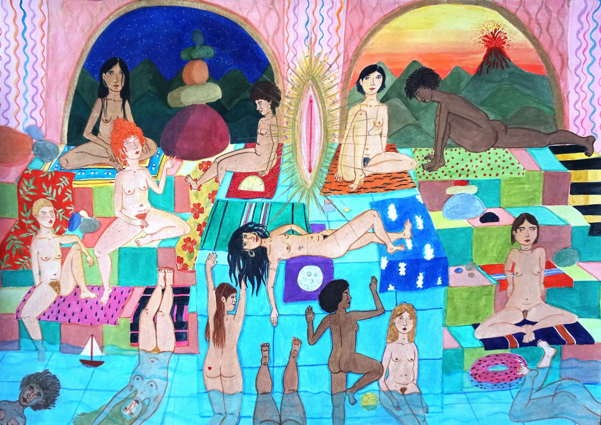 Golden Portal (2018), for example, depicts women of all colours lounging by a pool, some engaged in yoga poses, others in full relaxation mode. “They are all ultimate goddesses—it’s a celebration of womanhood,” Hernández says.