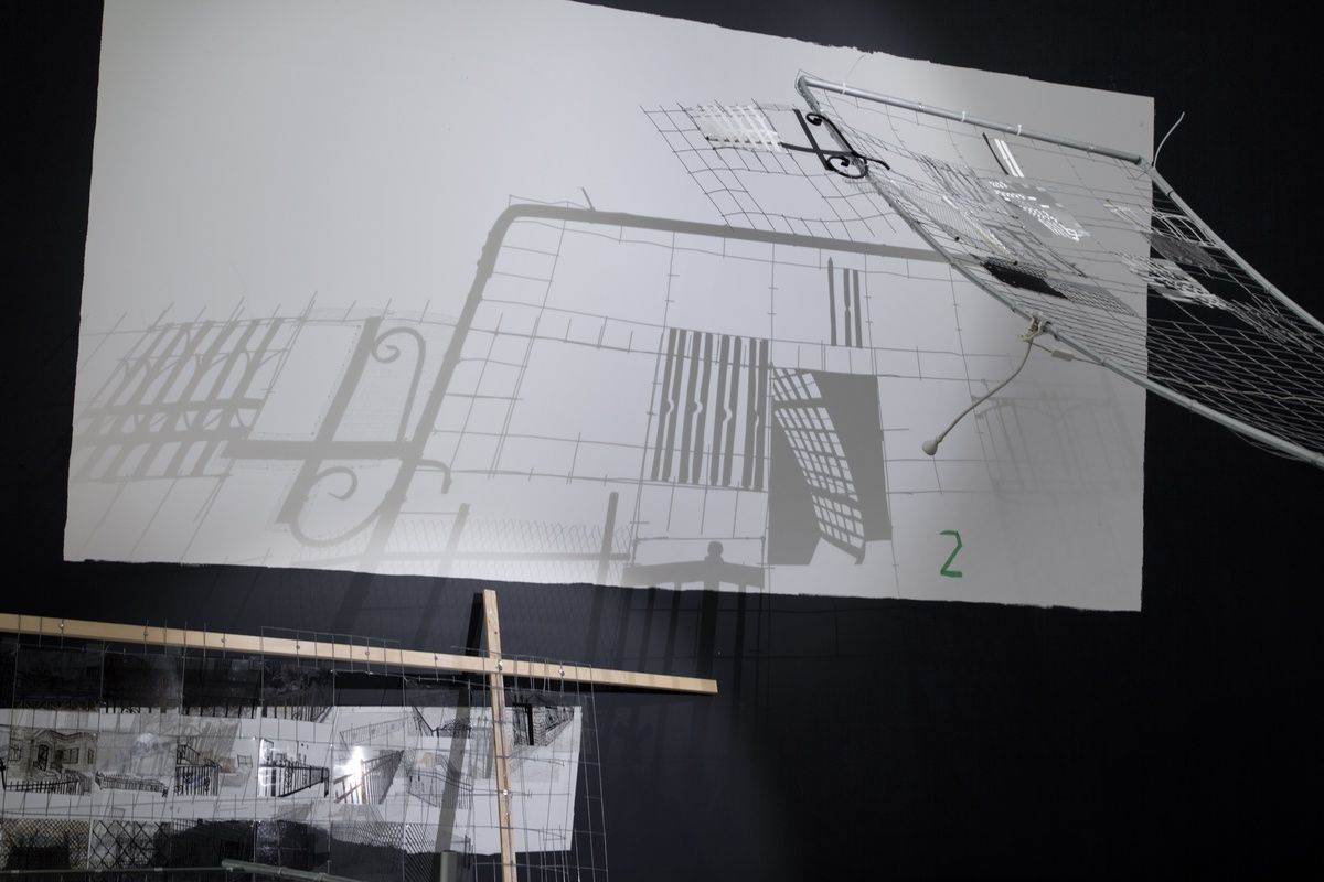 The work is made of wooden boxes used by shoe repairmen in Ghana