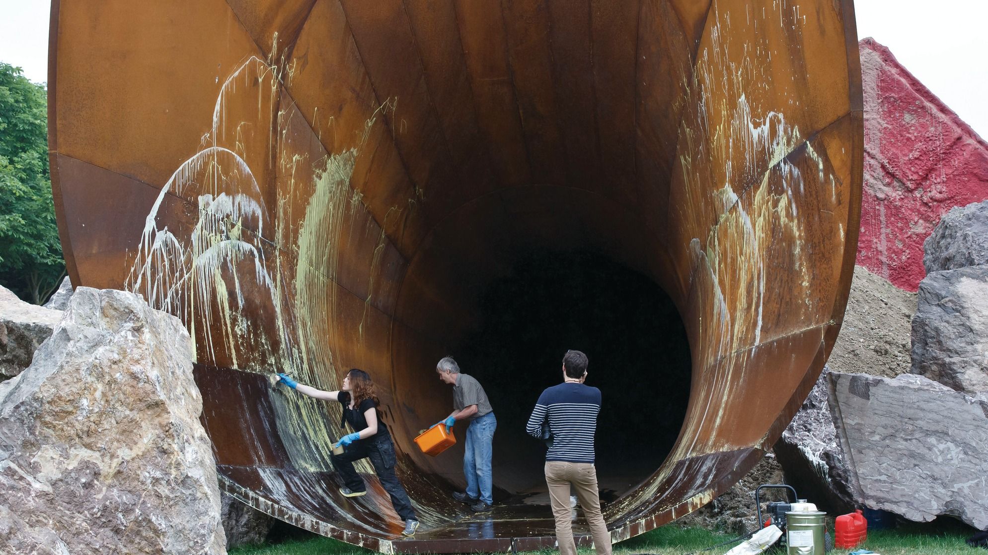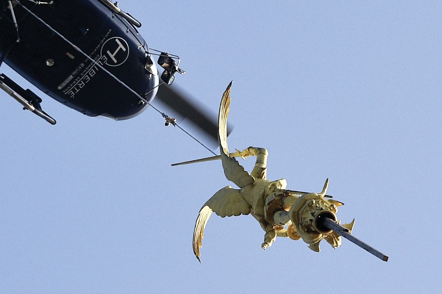 A 19th-century statue from Mont-Saint-Michel in Normandy was airlifted from its perch above the island abbey to be restored
