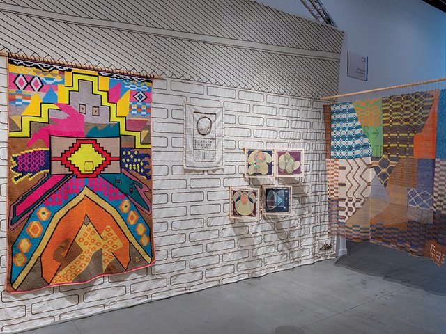 Textile-based art is abundant at the fair this year, from pieces approximating the forms of paintings but made of found fabrics to hand-woven, intricately beaded works and even a wearable, many-layered cape