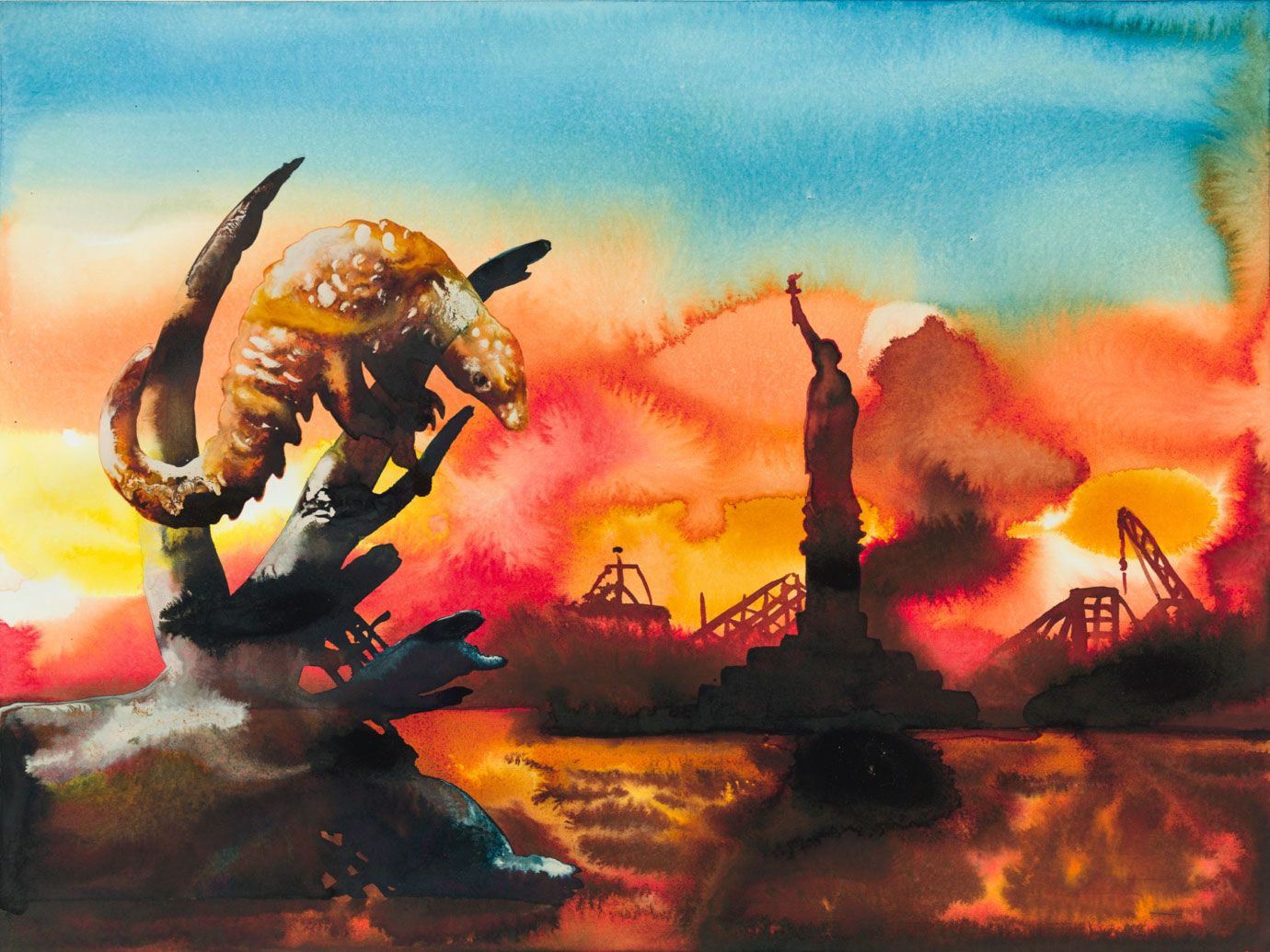 The paintings depict animals shipwrecked by the networks of capitalism grinding ecosystems to a nub, the artist says