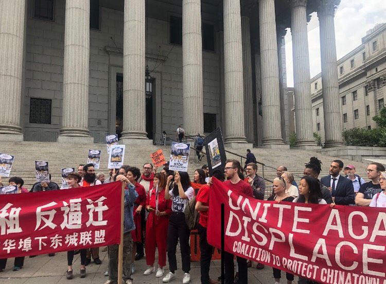 The coalition Art Against Displacement rallies against the construction of four contested luxury towers in a Manhattan Supreme Court hearing today