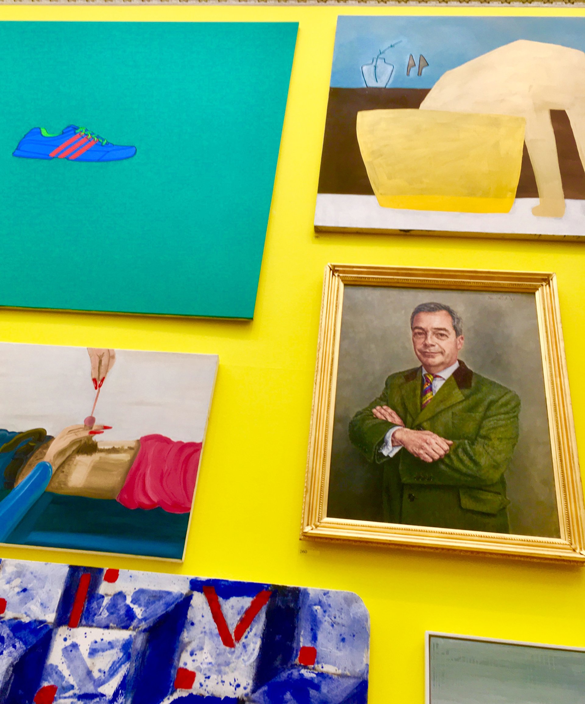 In this cheery spirit, Perry was responsible for the brilliant yellow walls and much of the packed hang of the largest gallery, with your correspondent delighted to learn that his choice of wall colour had apparently been inspired by the citrus-hued décor of her own sitting room. However, unlike Casa Buck, the works lining the RA’s Gallery III include a piece by Banksy influenced by a UKIP placard and valued at £350m, as well as a portrait of the former UKIP leader Nigel Farage, which is flanked by a painting of a vomiting figure and another work in which an unfortunate fellow is in the process of receiving a penile injection.