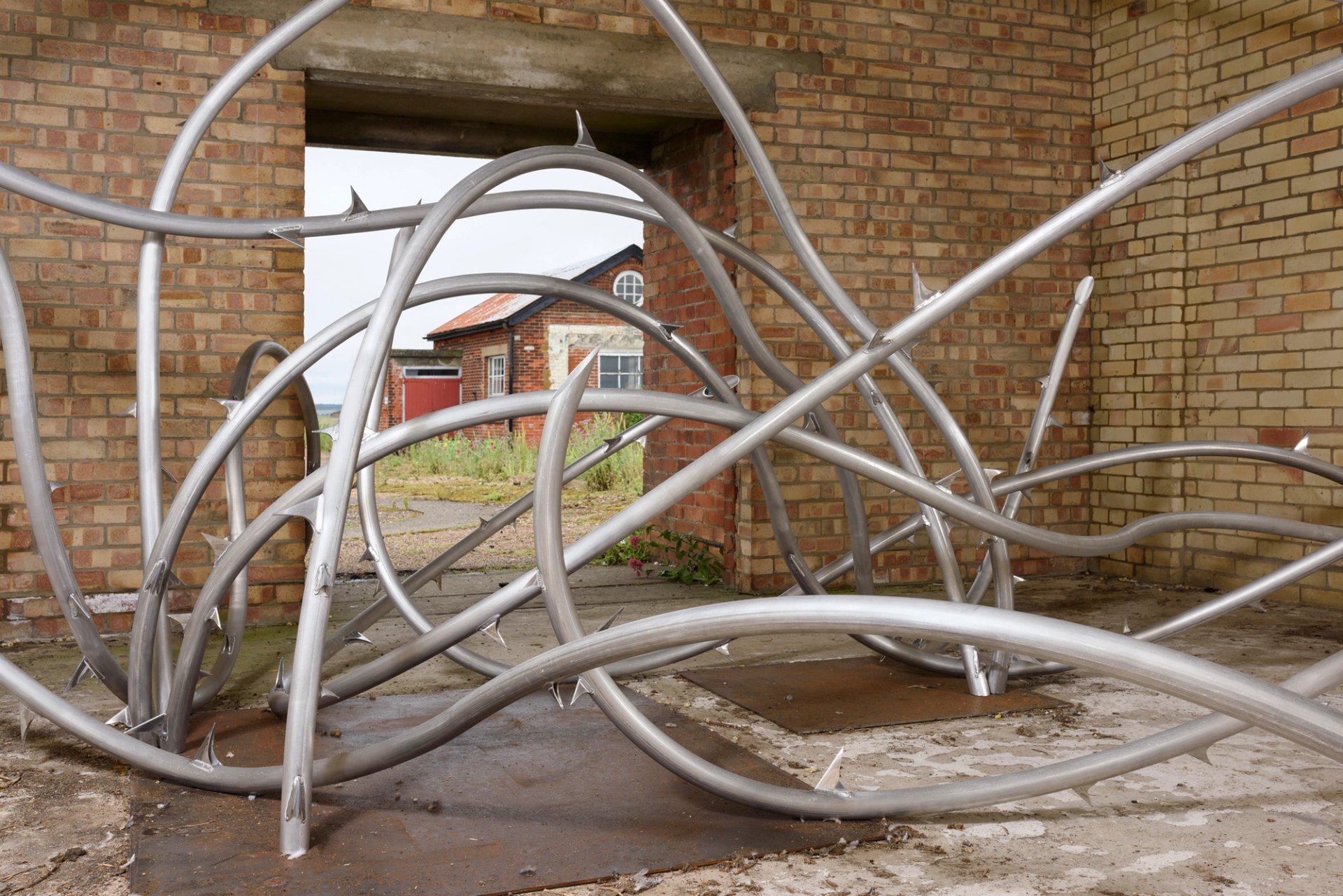 Nearby, a small brick building houses Alice Channer’s Lethality and Vulnerability, a tangle of giant brambles, with stems of welded aluminium rods and shiny steel thorns. This oversized metal briar sprouts up through the floor and bursts through knocked-out windows like a mutant triffid nourished on the toxic fallout of Orford’s dark past.