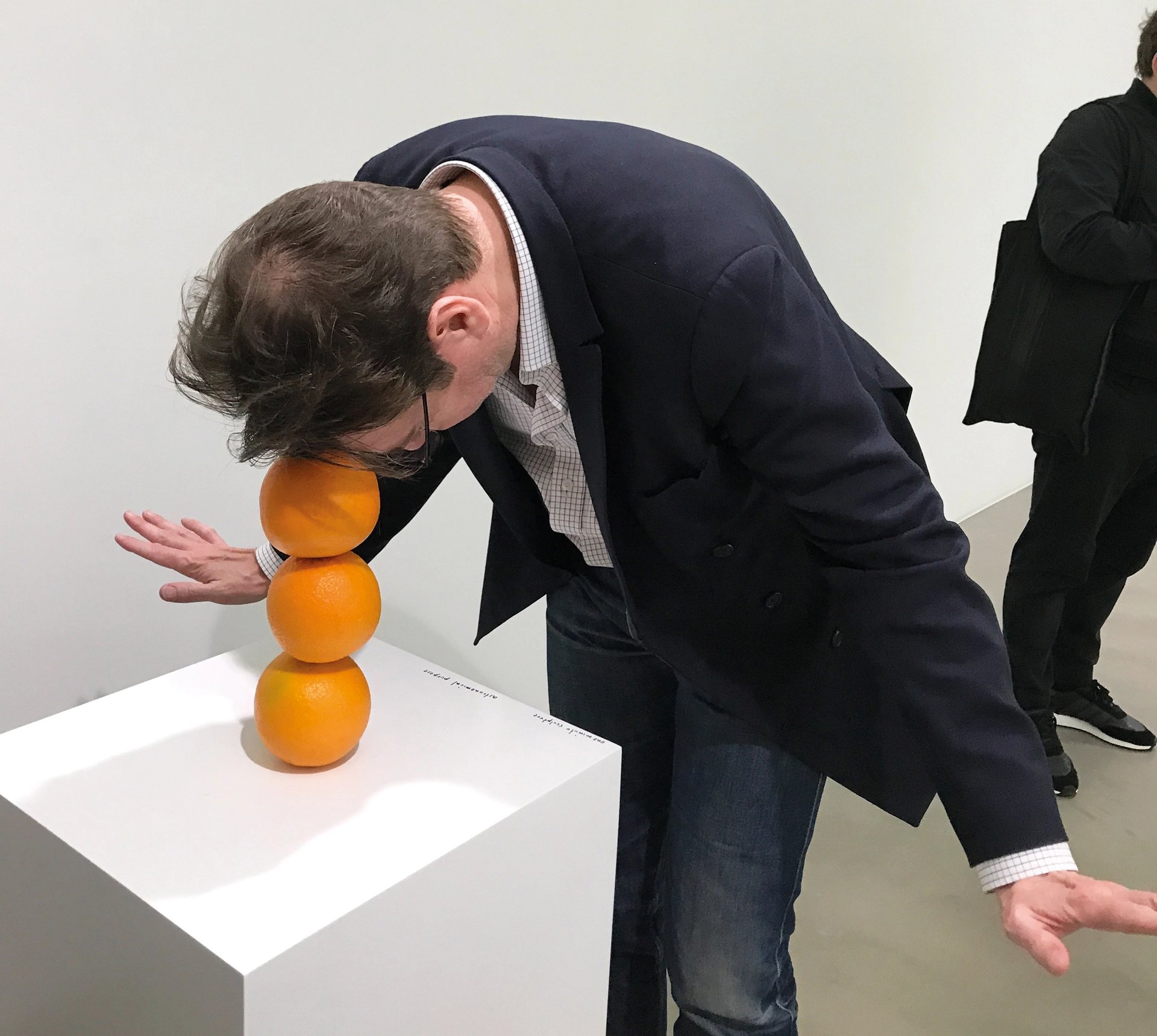 Have you ever felt the urge to build a fruity monolith out of three oranges, using only your forehead? You can at Lehmann Maupin’s Pedder building gallery, currently showing the Austrian artist Erwin Wurm’s celebrated one-minute sculptures (until 11 May), which invite visitors to pose and play with mundane objects. The dealer David Maupin has sussed out the best technique to tackle the trio of oranges. “You need the right amount of pressure—don’t push too hard or they’ll fall,” he counsels, proffering a wealth of unexpected advice on fruit-stacking.