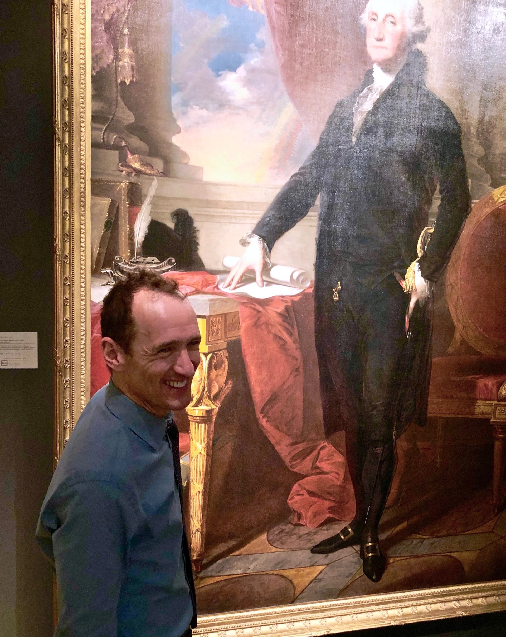 The Broadway producer Jeffrey Seller with a portrait of Gilbert Stuart at Tefaf New York Linda Yablonsky