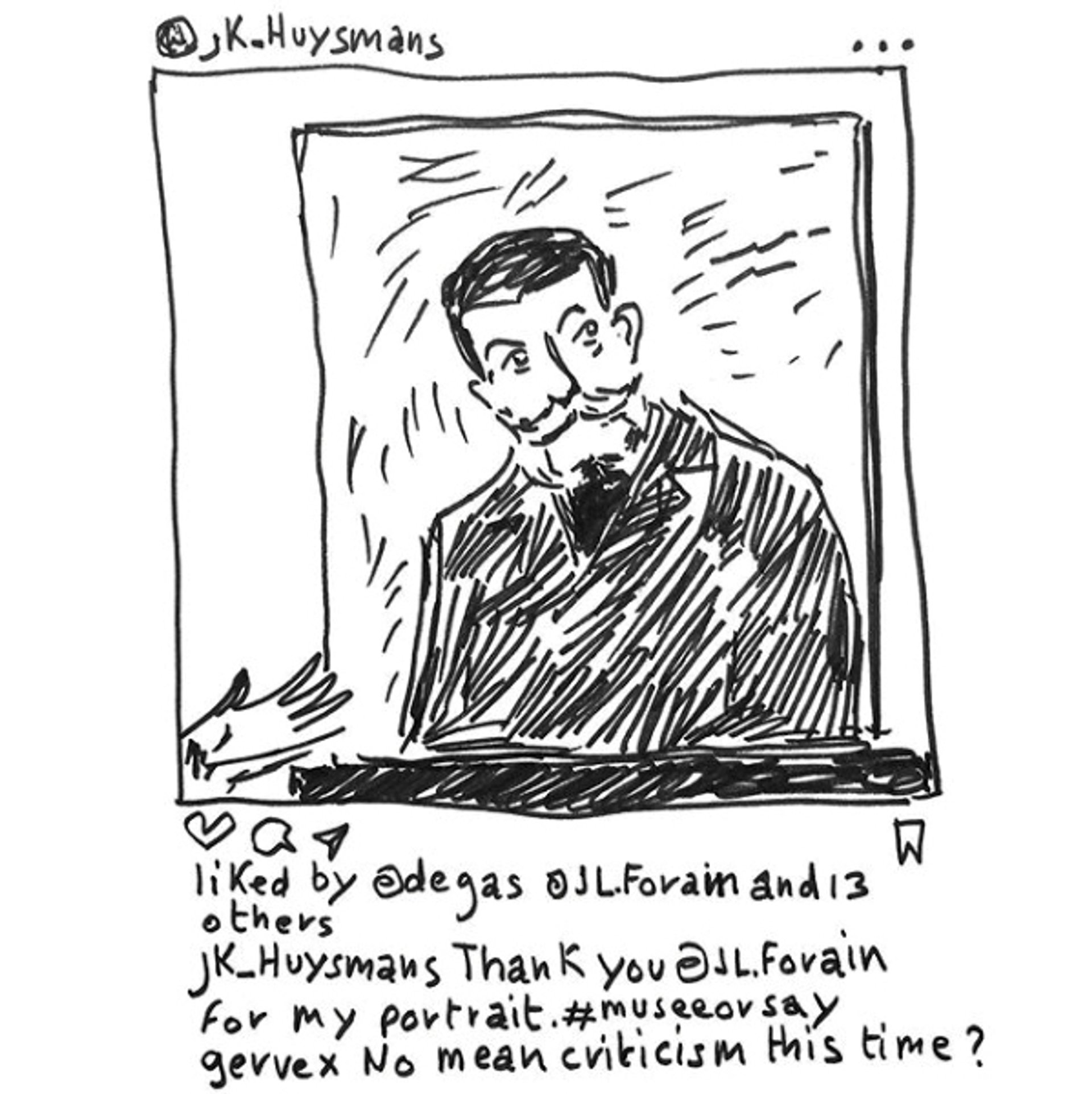 Armed with an Instagram account, an artist can almost sidestep the real-life art world entirely: you can show your art on Instagram, sell it—even make it—all from the comfort of your armchair. Last month, the Musée d’Orsay (@museeorsay) in Paris announced its first “Instagram artist-in-residence”, reminding us of another vital part of an artist’s life that has entered the digital realm. As part of his “residency”, the French illustrator and painter Jean-Philippe Delhomme (@jeanphilippedelhomme)—also a regular contributor to our sister publication, The Art Newspaper Edition Française—will post a new image each week for a year on the museum’s social media account. “The idea is to imagine what it would have been like if late 19th-century artists had been on Instagram and had their own accounts,” Delhomme tells The Art Newspaper. His first post on 7 January, pictured below, was a sketch of the 19th-century French art critic Joris-Karl Huysmans’s imagined Instagram post, thanking the Impressionist painter Jean-Louis Forain for a portrait of him.