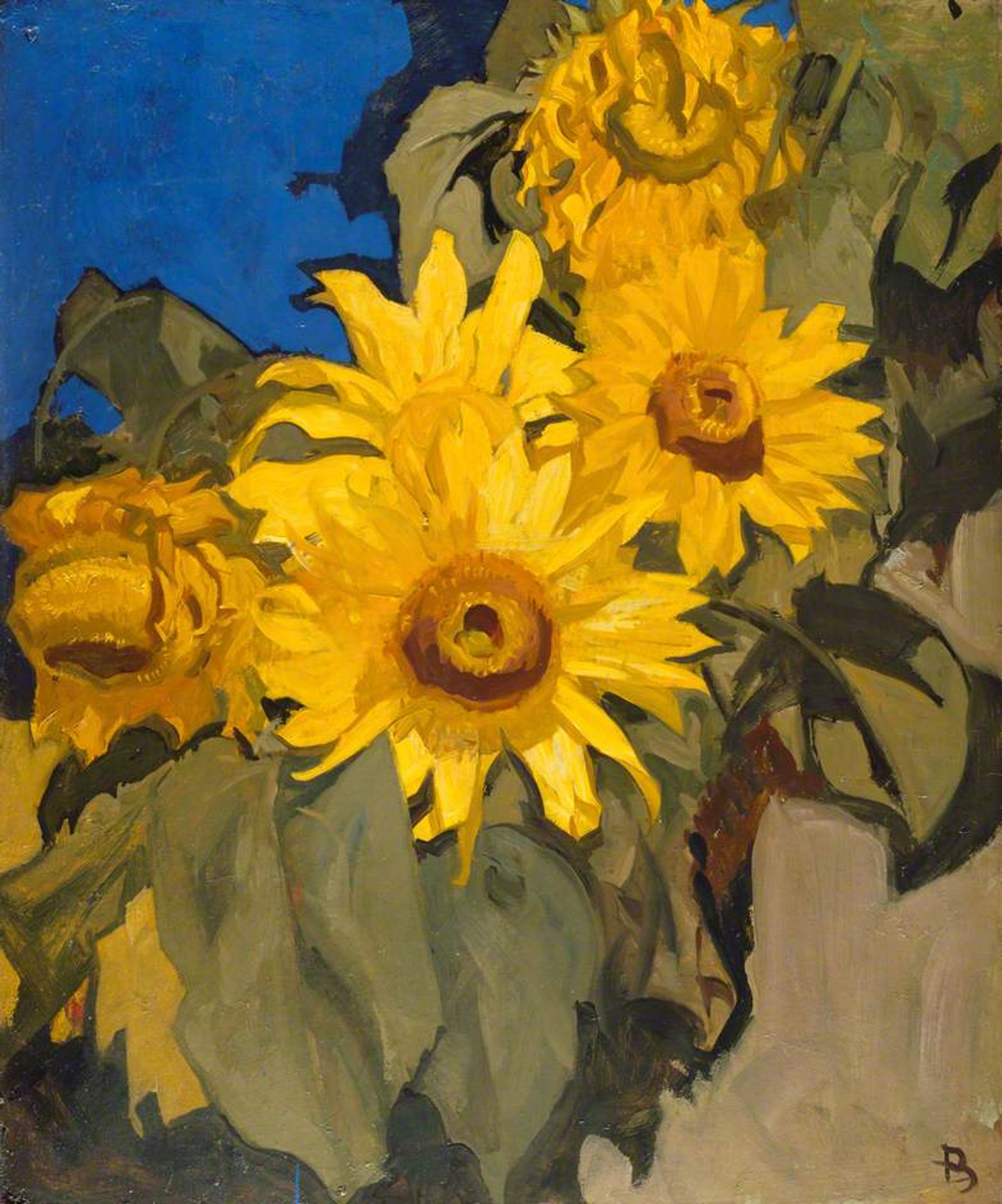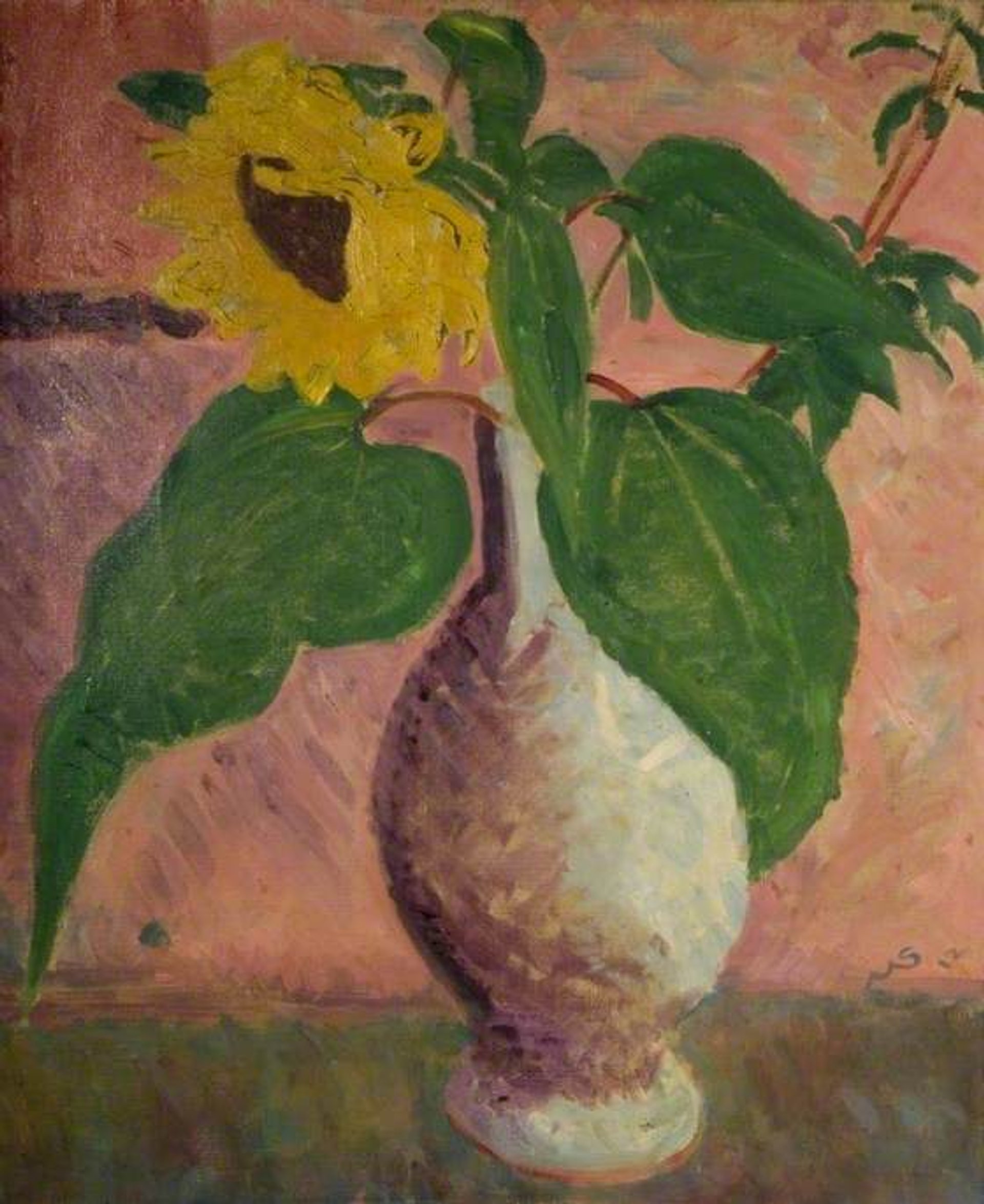Charles Ginner, another Van Gogh fan, had been born in Cannes to British parents and probably saw the 1910-11 Post Impressionist show in London. His still life composition includes seven sunflowers in a pot, a few pink flowers, a book and a small oriental bowl. Although Ginner’s dwarf sunflowers are of modest size compared with Van Gogh’s exuberant blooms, the inspiration must have come from the Dutch artist.