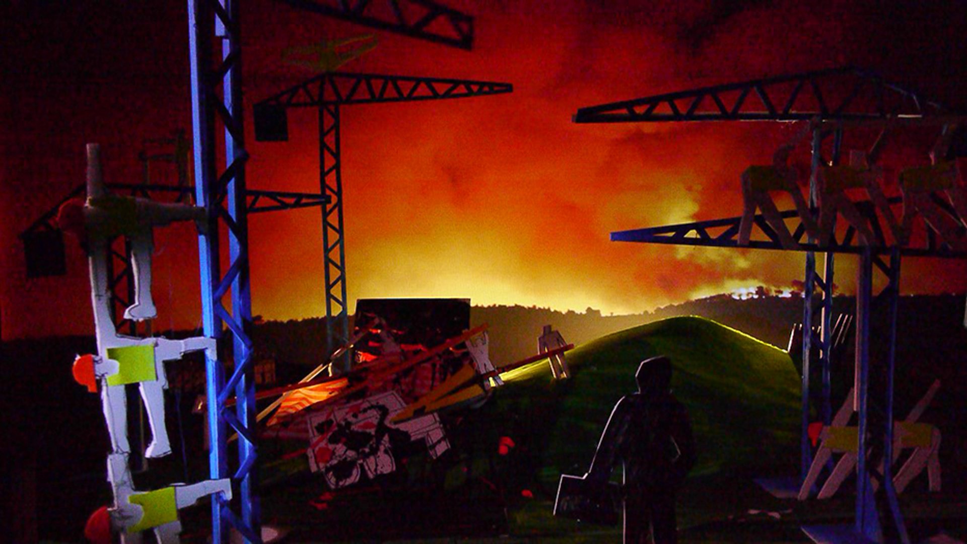 Still from Decorative Potential of Burning Factories by Bruce McLean and Gary Chitty (2019) Image Courtesy The Coronet Theatre