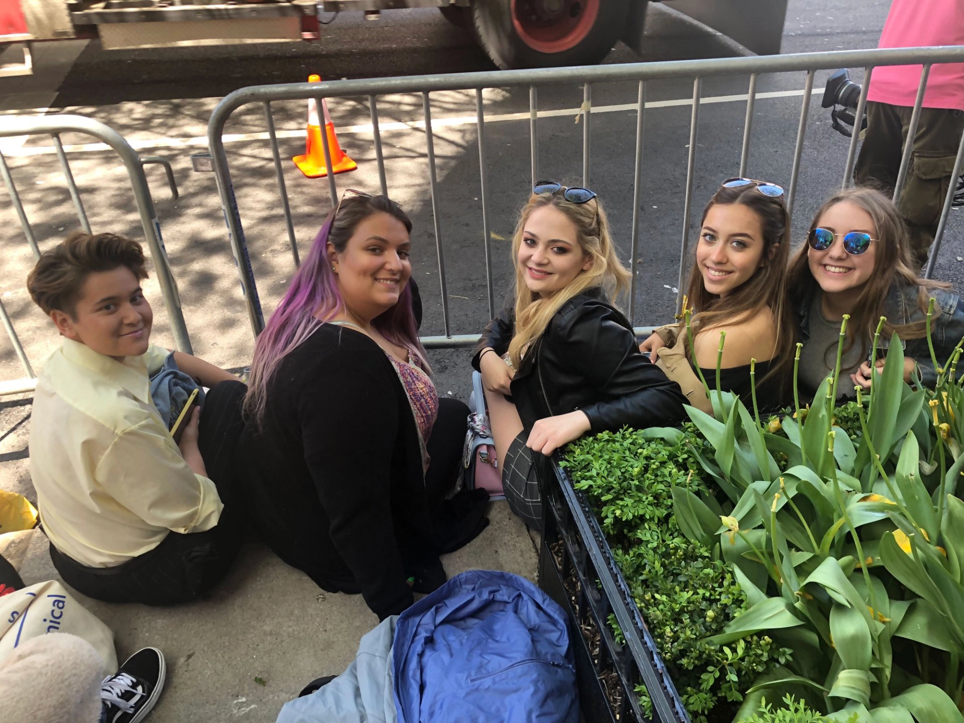 Another nearby group, Elizabeth, Tyler, Elle, Felicia and Nicole from Louisiana, Colorado and New Jersey, aged 17 to 19, were also excited to see Styles’ style. (And Lady Gaga, Tyler said.) They had only arrived at 10am and did not have a designated bathroom spot yet. “I might just not eat,” one said. We reminded them of the importance of hydrating—and sunblock.