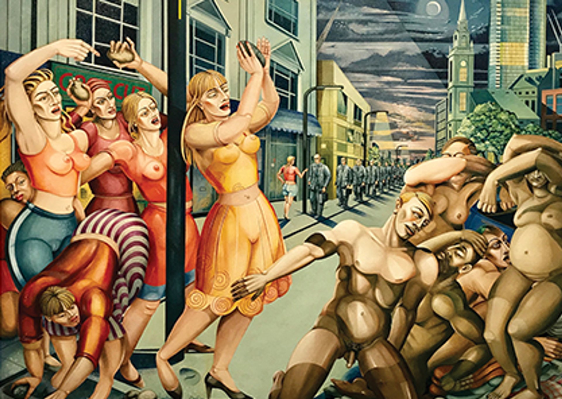 The distinctive, crisp-edged paintings of Caroline Coon were a glaring omission from the Sex Work section at Frieze London two years ago, which was dedicated to women artists whose explicit work placed them at the extreme edges of feminist practice. In Coon's figurative works the tables are repeatedly turned on male power present throughout centuries of art history and beyond, with both male and female genitalia defiantly celebrated. In one case, Botticelli’s The Birth of Venus (around 1480s) is triumphantly reborn as a hermaphrodite. In another, Manet’s Olympia (1863) is reimagined as a gleamingly oiled black man, admired by a white maid as he cradles his semi-erection. In her coruscating series The Brothel, the customers of sex workers repeatedly get their comeuppance, appearing at turns vulnerable and ridiculous, culminating in the vengeful biblical-style painting Prostitutes, Stone the Hypocrites! (2002).