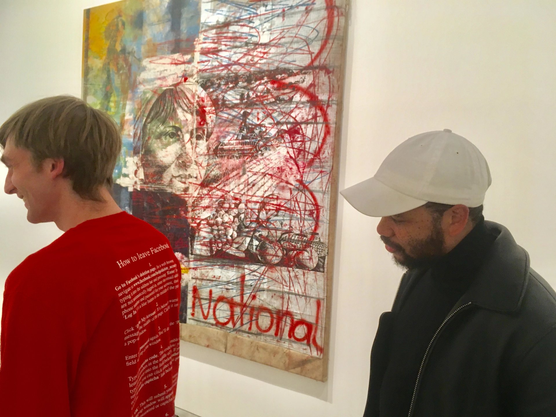 Oscar Murillo, in front of his painting Tamawuj (2017), learns how to quit Facebook, courtesy of Jeremy Deller's shirts Louisa Buck