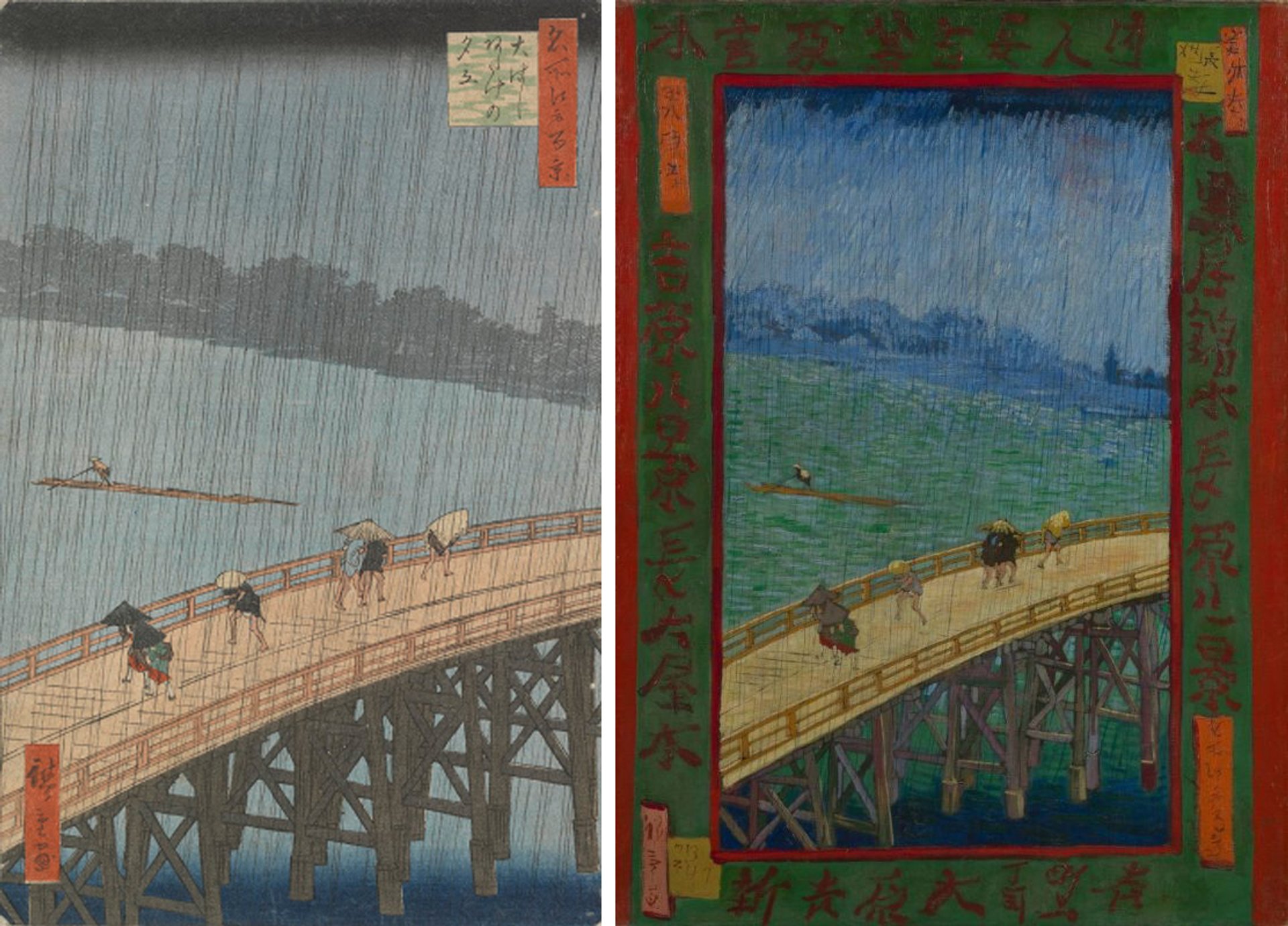 Left: Utagawa Hiroshige’s Sudden Evening Shower on the Great Bridge near Atake (1857); and right: Vincent van Gogh’s Bridge in the Rain (after Hiroshige) (October-November 1887) Courtesy of the Van Gogh Museum, Amsterdam (Vincent van Gogh Foundation)