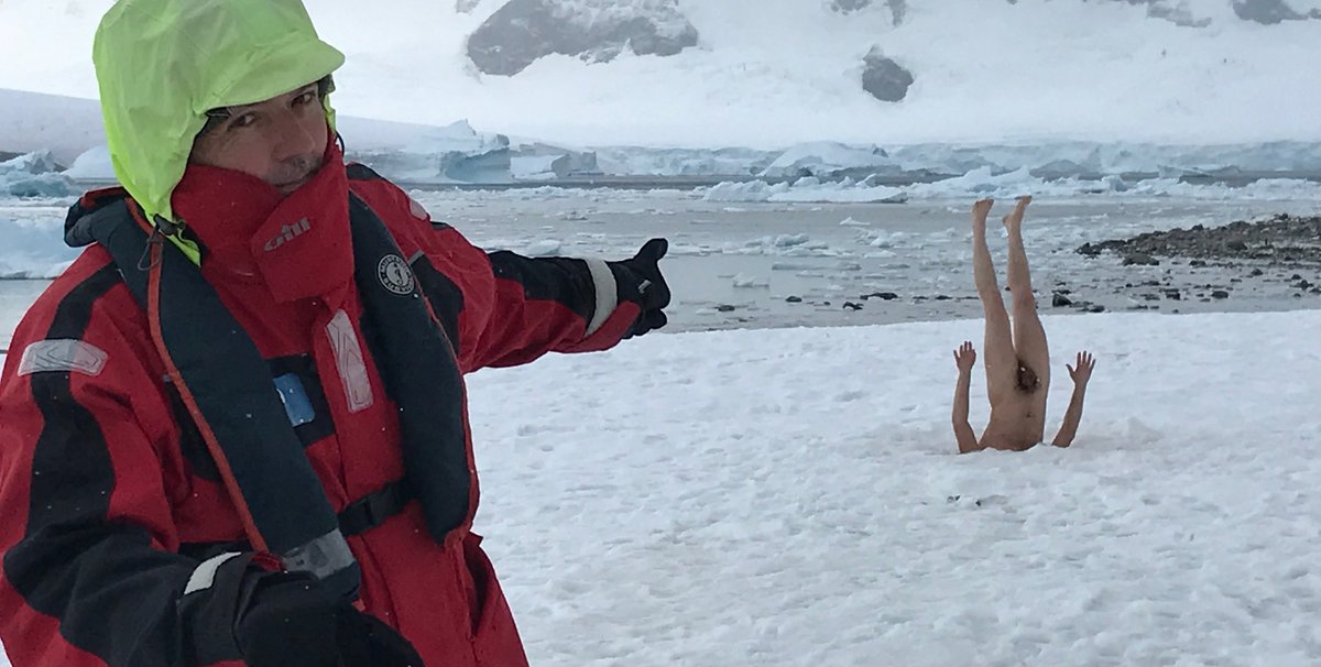 Our first ‘Antarc-art’, the ‘Glaciators’ created by Argentine Joaquín Fargas, handmade robot vehicles clanking along the ice like Meccano toys to the amusement of a few Penguins. And then a great surprise; the strapping young Russian artist Andrey Kuzkin suddenly goes stark bollock naked, standing upside down with his head buried in the freezing earth, feet straight up in the air. He had dug himself a hole for his head, breathing through a snorkel, and remained like that for a long time, at least ten minutes, a strong, shocking vision in this blasted landscape. The series is called ’99 Landscapes with a Tree’, begun in 2010 partly in homage to his late father who created a lithograph of the same title. Kuzkin will perform ninety-nine times as this bare human tree all over the world and has already been arrested in front Big Ben. Indeed ‘Big Ben’ is the appropriate nickname for Kuzkin considering the impressive dimensions of his oeuvre in this freezing weather. Port Circumcision indeed ! Wild applause, penguins flapping their wings, when he finally comes down, body blue with cold but otherwise beaming, shaking hard from his daunting performance. A contrast with the very shy egg made of PVC brought all the way from China by Xhang Engli, nicknamed in turn ‘The Egg Man.’