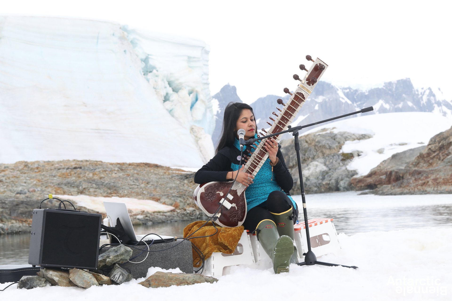 Speeding off again to Wordie House, a wonderful English post now run as historic site. Our tour company had brought down the entire Wordie family but due to ice could never actually visit, the reality of tourism down here. Out on the ice floe Shama with sitar singing her hit single ‘Ships in the Night’. Followed by Lou Sheppard from Canada, sporting a nifty bow tie, for the world premiere of her commission ‘Requiem for Antarctic Coastline’, scored to the chart of this same coastline we now stand upon. It looked as if the seals were playing with each other to the tune, one just lying there totally out of it, on back, flapping wings lazily. So funny the penguins swimming fast through sea, leaping, black and white flashes through the waves.