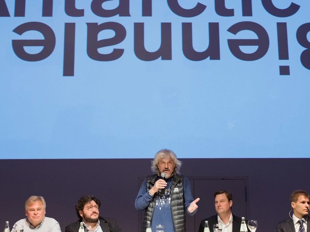 Down to evil basement for first day of presentations; Jean de Pomereu as photographic artist originally drawn to Antarctic entirely by aesthetics, the minimalism and purity, platinum prints from his 'Topography of Absence' series. His photographs of Lita Albuquerque ‘Stellar Axis’ blue spheres very like Yves Klein I had just seen back at Fundación PROA. ‘Land Art’ is no longer supported in Antarctica, takes up far too many resources, and British ‘Artist in Antarctic’ program stopped recently.
