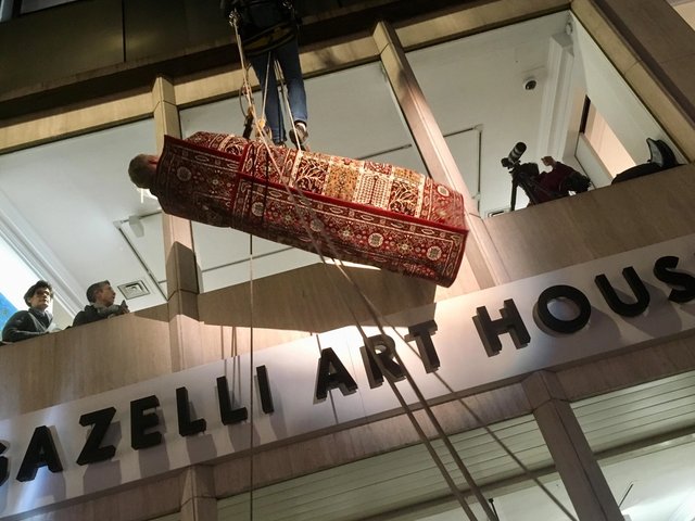 There was some consternation among guests—who included Conrad Shawcross, Lisson Director Nicholas Logsdail and a rather bemused- looking Salman Rushdie—as the mobile upright box containing the American artist Alexander G. Lyle IV trundled around the main hall, causing something of an obstruction around the Persian buffet and at times threatening to topple a large cast iron Antony Gormley sculpture. However, the evening’s acknowledged show-stopper was the event’s co-curator Fyodor Pavlov-Andreevich. Fyodor is renowned for his extreme actions which generally involve nudity and some kind of bodily abuse and true to form, on this occasion he had removed all his clothes and was lying prone on a table at the top of the main staircase which had been fitted with sensors so that visitors could “play” his naked body like an instrument. Quite mild for him, although—in the interests of research, of course—your correspondent discovered that some parts of his anatomy elicited more noise than others. What Mrs Maleki’s Mayfair neighbours made of such performative shenanigans is not yet known, but let’s hope the released adoptive flies did not remain too close to home.