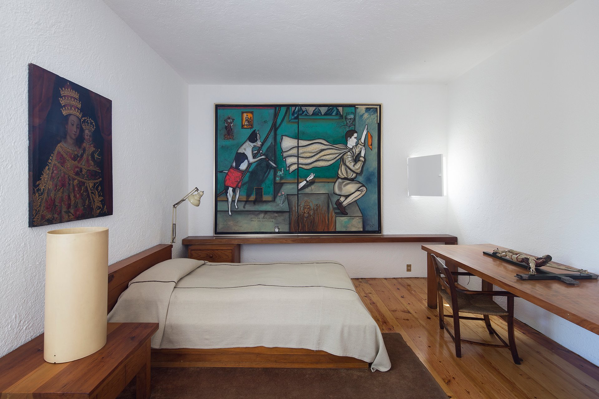 One standout was a dreamlike, 1985 painting by Julio Galán, a flamboyant personality befriended by Andy Warhol (and shown last year in New York by Timothy Taylor Gallery). Its imposition on a wall in a guest room is not only appropriate to the space but enlivens its dominant Catholic imagery and objects, which seem equally surreal. Black Christ, by Reyes, is almost frightening in both its effect on, and sympathy with, the architect’s super-austere bedroom.