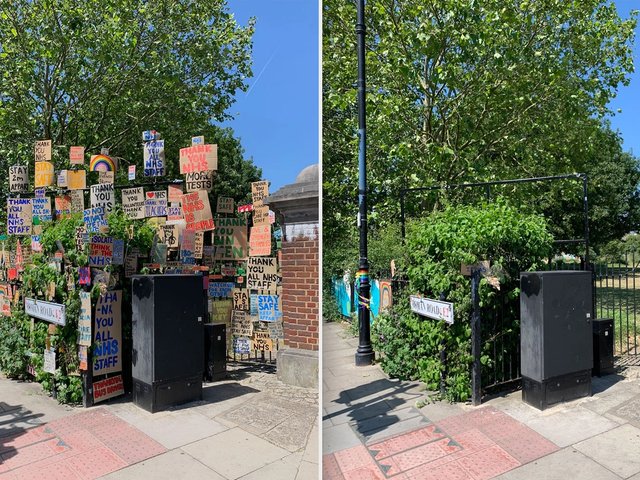 Over the past few weeks a colourful mass of hand-painted cardboard signs have been mysteriously appearing on the railings of Wennington Green, a patch of public parkland at the junction of Roman and Grove Roads in East London. Bearing positive messages of thanks and support for the NHS and key workers, the forest of over 500 placards clusters around the Roman Road sign and continues to creep further up the street, getting bigger every day. Amidst the tide of goodwill and gratitude there are also some sterner notes: “Isolate think of others,” reads one sign; “do not privatise the NHS”, “more tests”, “stay 2m apart”, “more PPE”, read others.