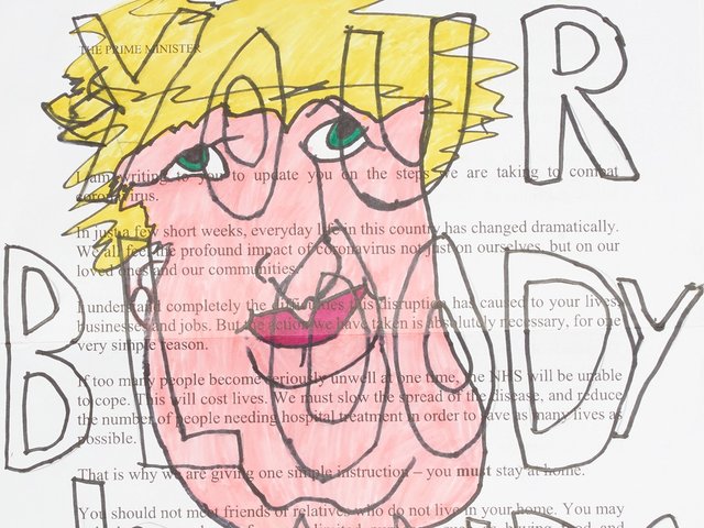Making this work has now become a daily lockdown ritual. Every afternoon Liversidge paints the signs in acrylic paint on cardboard—sometimes there have been over 40 in a batch—drying them off with hair dryers and putting them up each night. He has been greatly encouraged by the response he receives while on his nocturnal excursions as he adds to the signs. “The Homerton and the Royal London hospitals are both very close, and NHS workers often pass by,” he says. “A few days ago, I had a great conversation with a retired doctor who said that the signs had really cheered up all the wider NHS family she was still in contact with. Then I’ve had a car full of nurses all applauding as they drove by; and one night an ambulance driver rolled down his window and shouted, ‘That’s fucking brilliant!”’