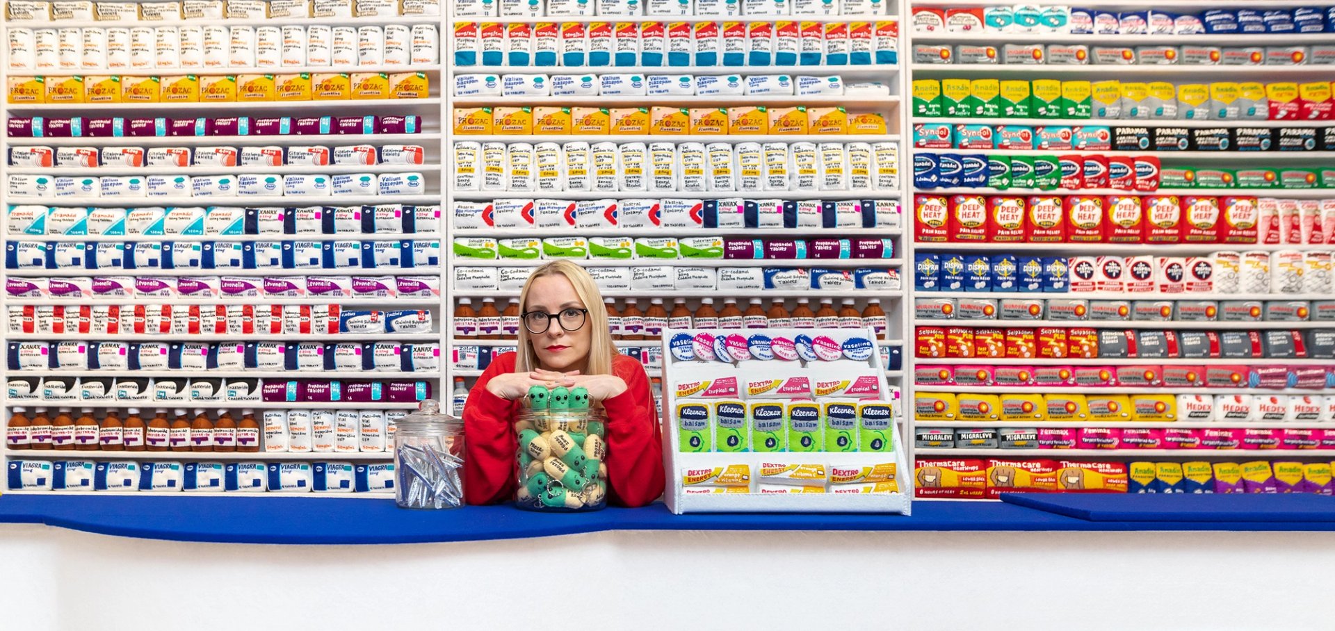 Bourden Street Chemist is such a convincing replica that locals have been popping in and trying to buy toiletries and medication. Lining its floor-to-ceiling felt-covered shelves and organised in labelled sections are soft fabric versions of all the familiar brand products that you’d expect from a pharmacy, from painkillers to cold remedies, toothbrushes to cotton wool buds. There are branded perfumes, a Rimmel makeup counter as well as Colgate toothpaste and Dove soap bars, as well as an extensive range of female sanitary products and Durex condoms. Behind the counter are stacked a wide range of prescription drugs including Tramadol, Prozac and Viagra, dispensed personally by the white-coated artist.