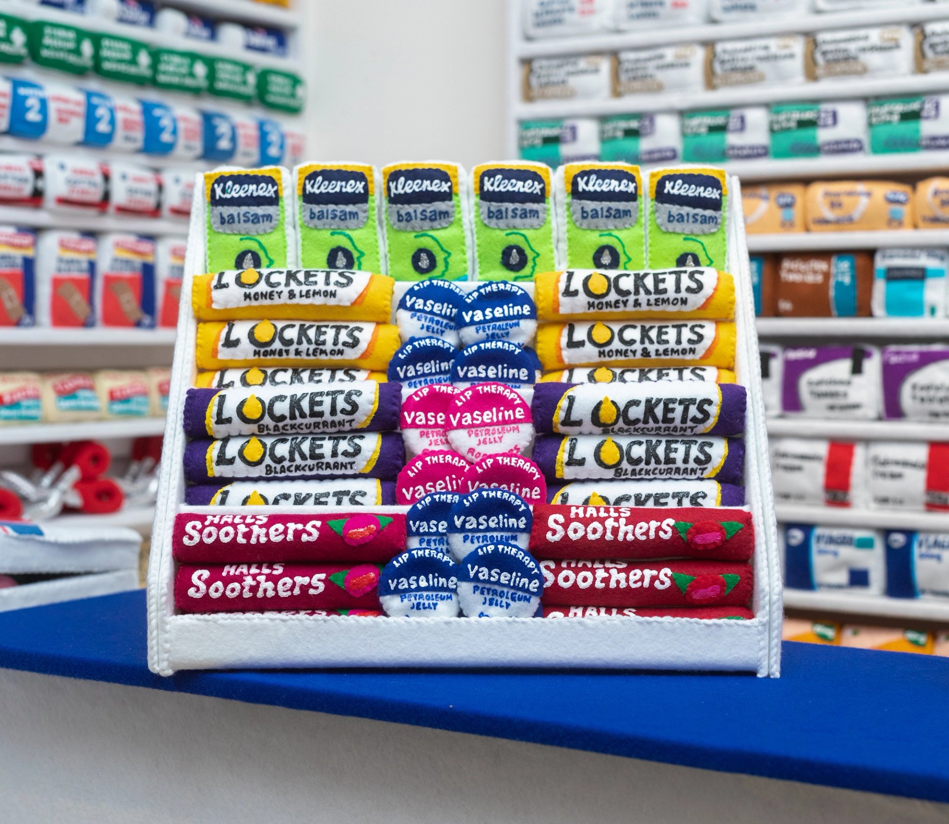 In the past, Sparrow has given a Soho sex shop, a New York bodega and an East London corner shop the felt treatment. Now she’s taken over the Lyndsey Ingram Gallery in Mayfair and transformed it into a fully stocked pharmacy, with all its branded products rendered in felt. “I like that it's a childlike material. I like that it's cheap and cheerful, it’s not bronze,” says Sparrow of her trademark medium. “There’s a lot of snobbery that detracts from the serious art making that goes into this.”