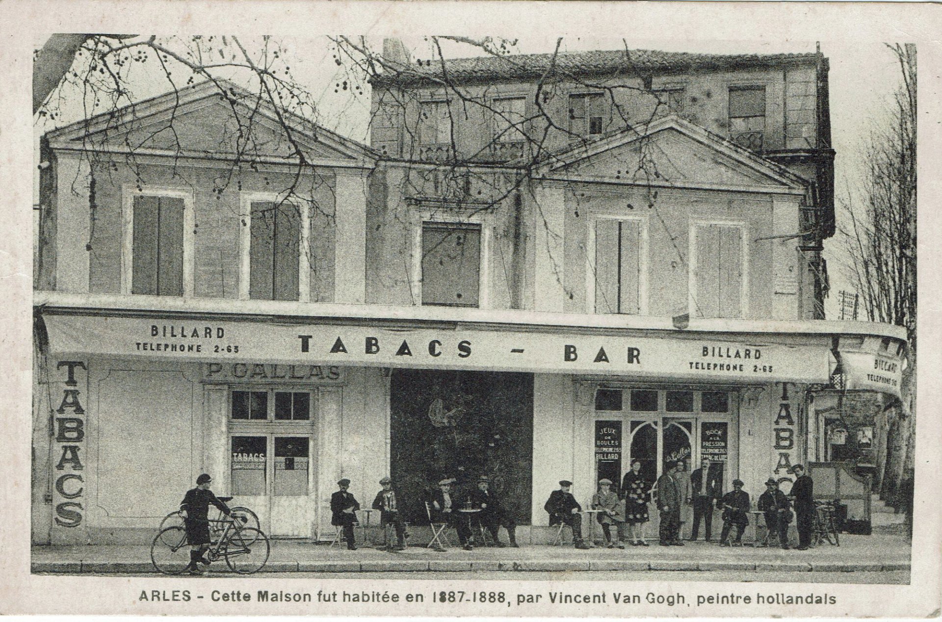 Van Gogh’s life revolved around Place Lamartine, much of which can be seen in his vibrant painting of The Yellow House (1888), set under a deep blue sky. Next door, under the awning, was a grocery shop run by François and Marguerite Crévoulin, a convenient place to buy necessities. Further to the left, in the pink building behind a tree, was the restaurant of 70-year-old Marguerite Vénissac, where Van Gogh took his suppers. Beyond that, further to the left (but just outside the painting), was the all-night Café de la Gare, which he patronised. On the right side of the painting, the Route de Tarascon runs into the countryside where Van Gogh created some of his finest landscapes.