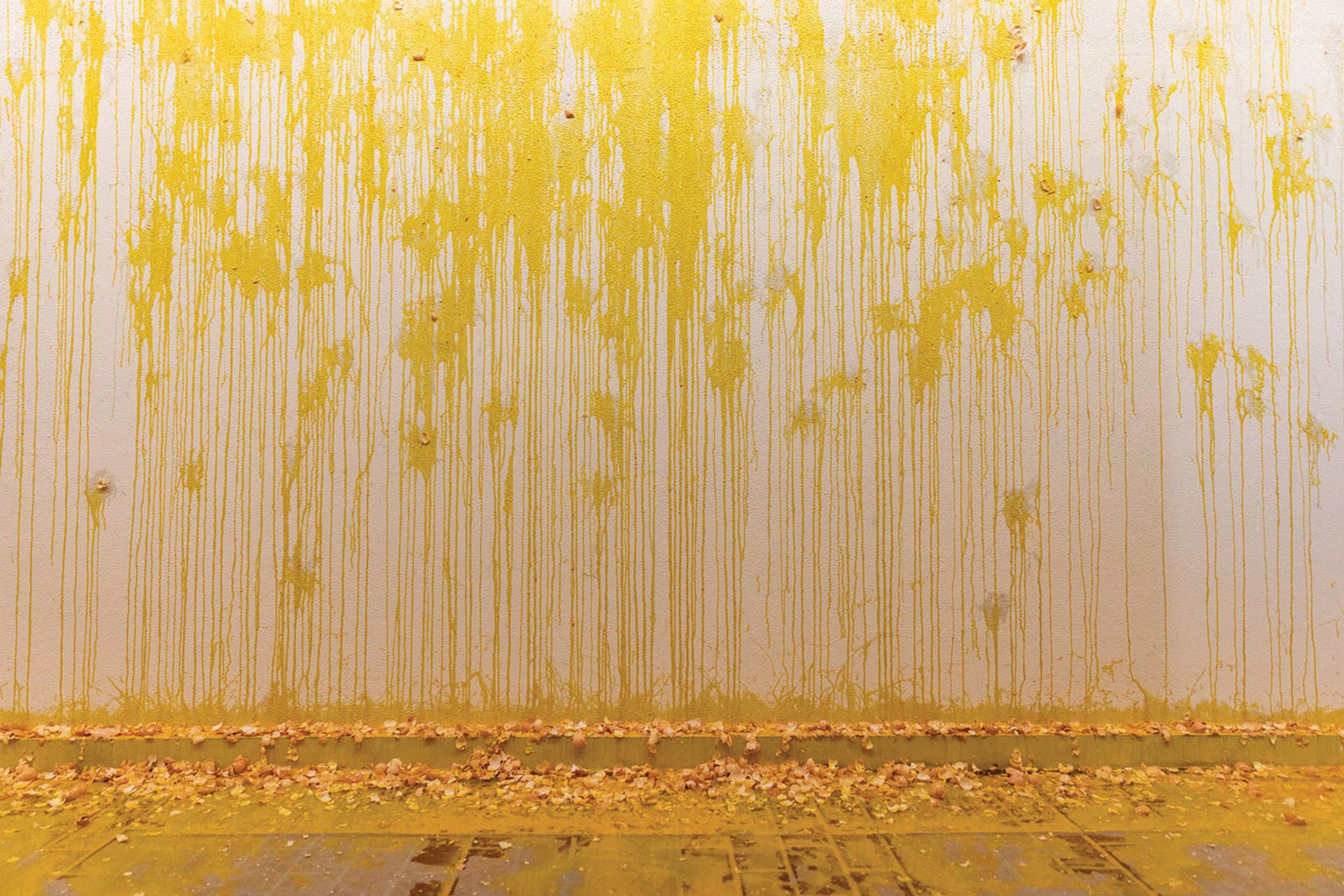 No sooner had the museum’s entrance wall been transformed into a yolky Cy Twombly lookalike than an elegantly arranged pile of bananas was wheeled in and another mass performance ensued. In an unprecedented remake of her classic 1991 photographic portrait, Lucas invited the throng to eat a banana with her and—amidst a renewed frenzy of cameraphone wielding—everyone, including the Yans, did so with gusto.