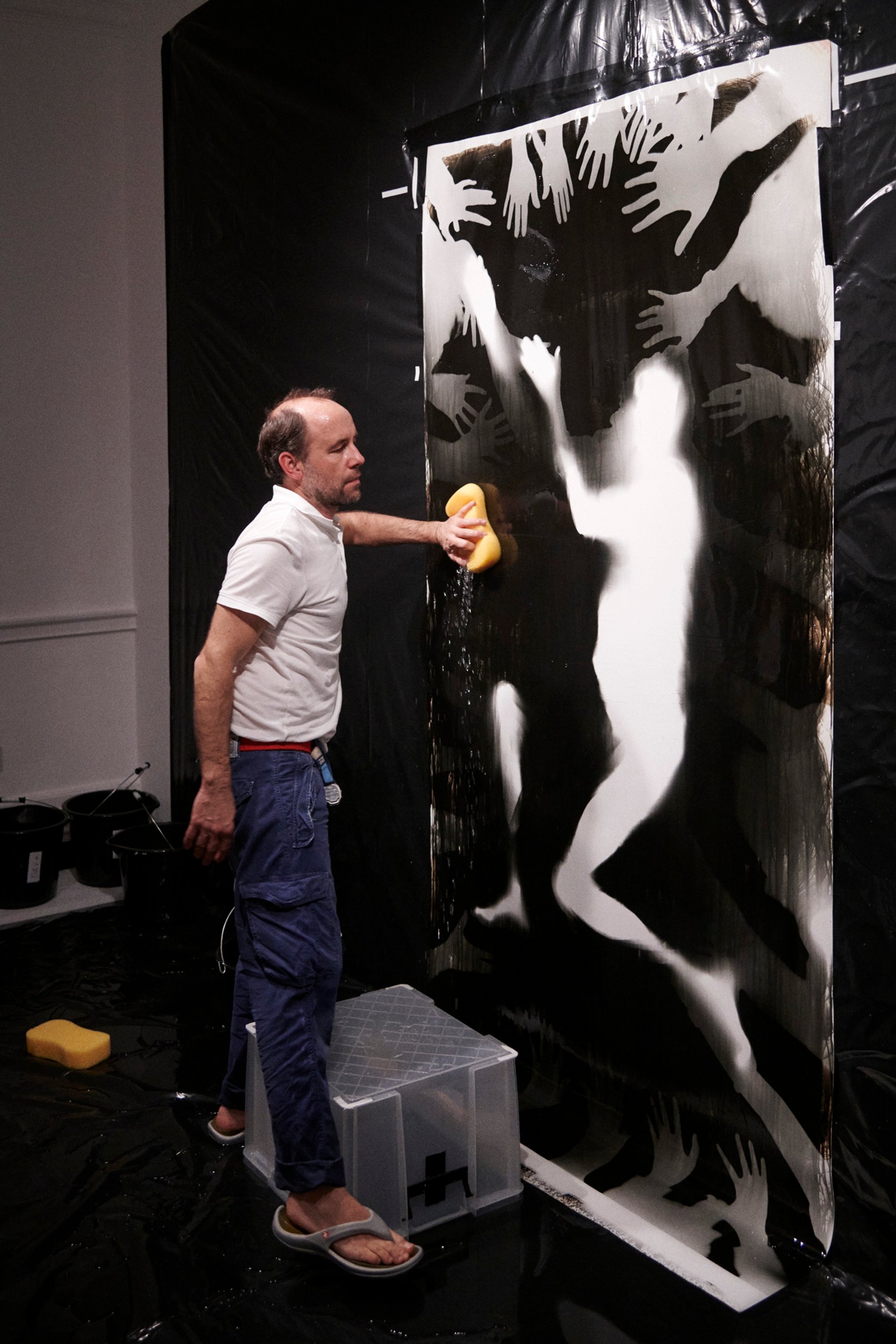 Last night (9 January) a small select audience were treated to a unique performance by Frank Uwe Laysiepen, better known as Ulay, the conceptual artist and former consort of Marina Abramovic, to mark the opening of his first solo show at Richard Saltoun gallery. Described by Ulay as a “peformative photographic event”, Performing Light found the artist combining his lifelong parallel preoccupations with photography and performance by transforming the back gallery into an immersive dark-room and using his body to create an on-the-spot photogram.