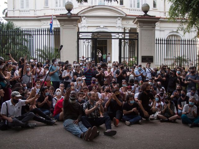 The artist Luis Manuel Otero Alcántara and the poet Afrika Reina were violently taken from their home while conducting a five-day performance parallel to the Congress. Each day, Otero Alcántara planned to voluntarily sit for eight hours with his arms tied behind him on a garrote chair, a device used to execute revolted slaves during colonial times. After the first day, state agents raided the San Isidro Movement headquarters for the second time in six months. The artists were violently arrested, without their shoes or masks, while the agents destroyed Otero Alcantara’s paintings and sculptures.