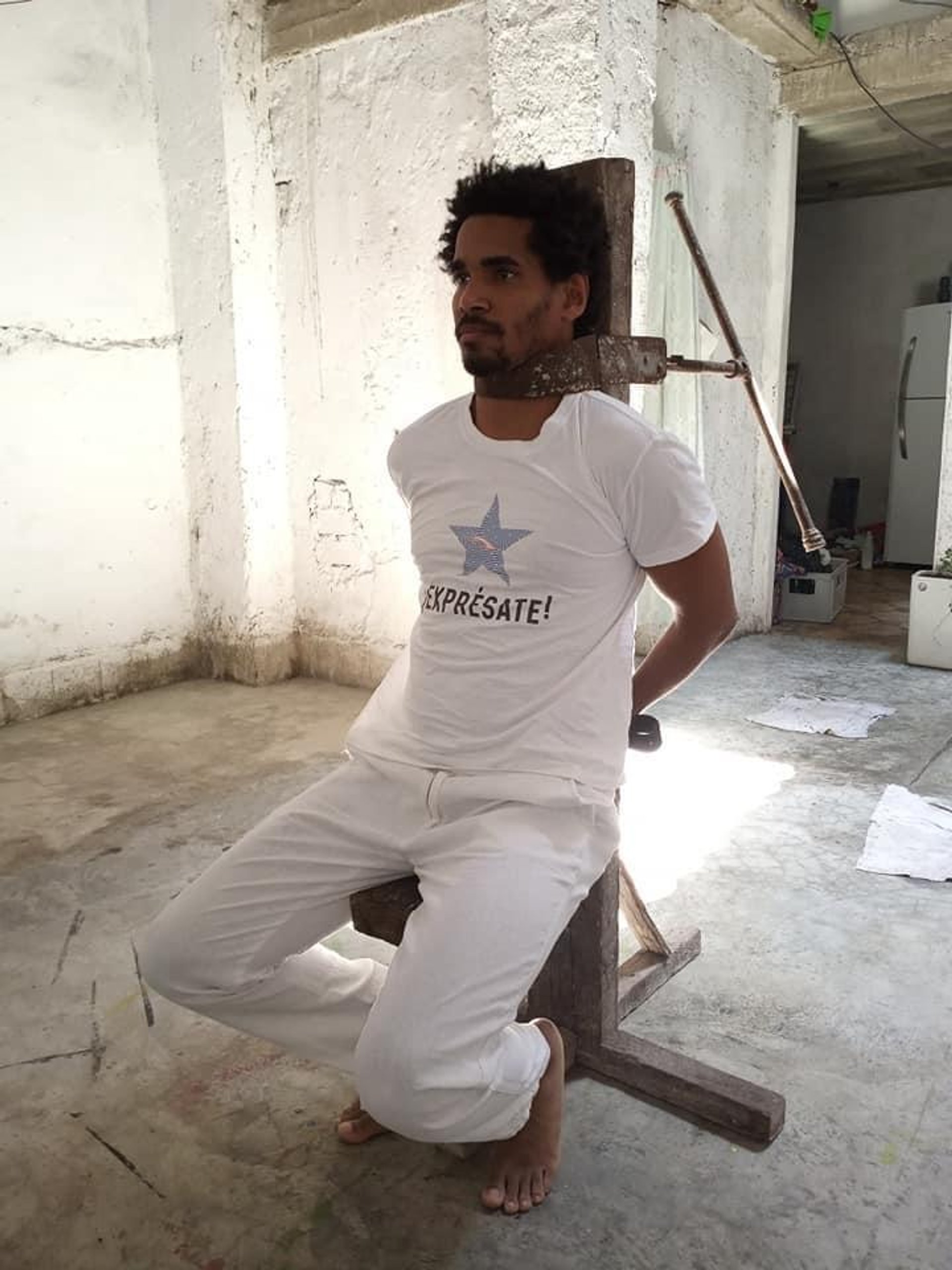 In a performance last week, the artist Luis Manuel Otero Alcántara sat with his arms tied behind him on a garrote chair, a device used to execute revolted slaves during colonial times, before police raided the building