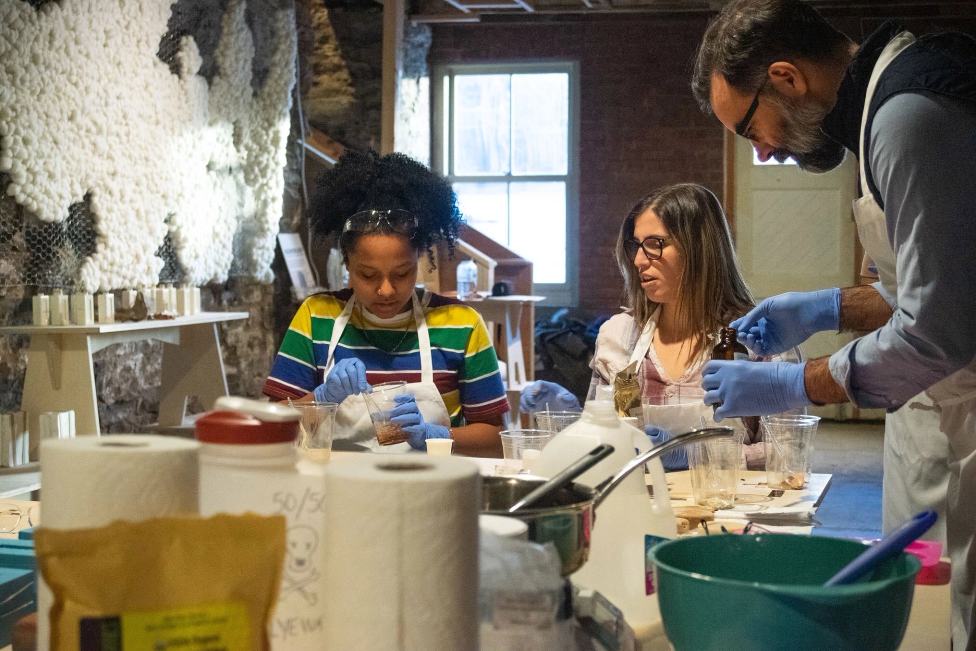 A local artisan, a Pratt faculty member, and a local high school student work together on a new project that will lead to supporting the creative economy in Kingston, New York. Photo: Nigel Sequeira, Graduate Communications Design '19