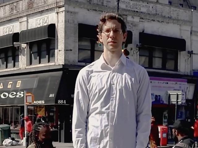 The work features a 1:10 loop of a business-class white man standing on an auction block