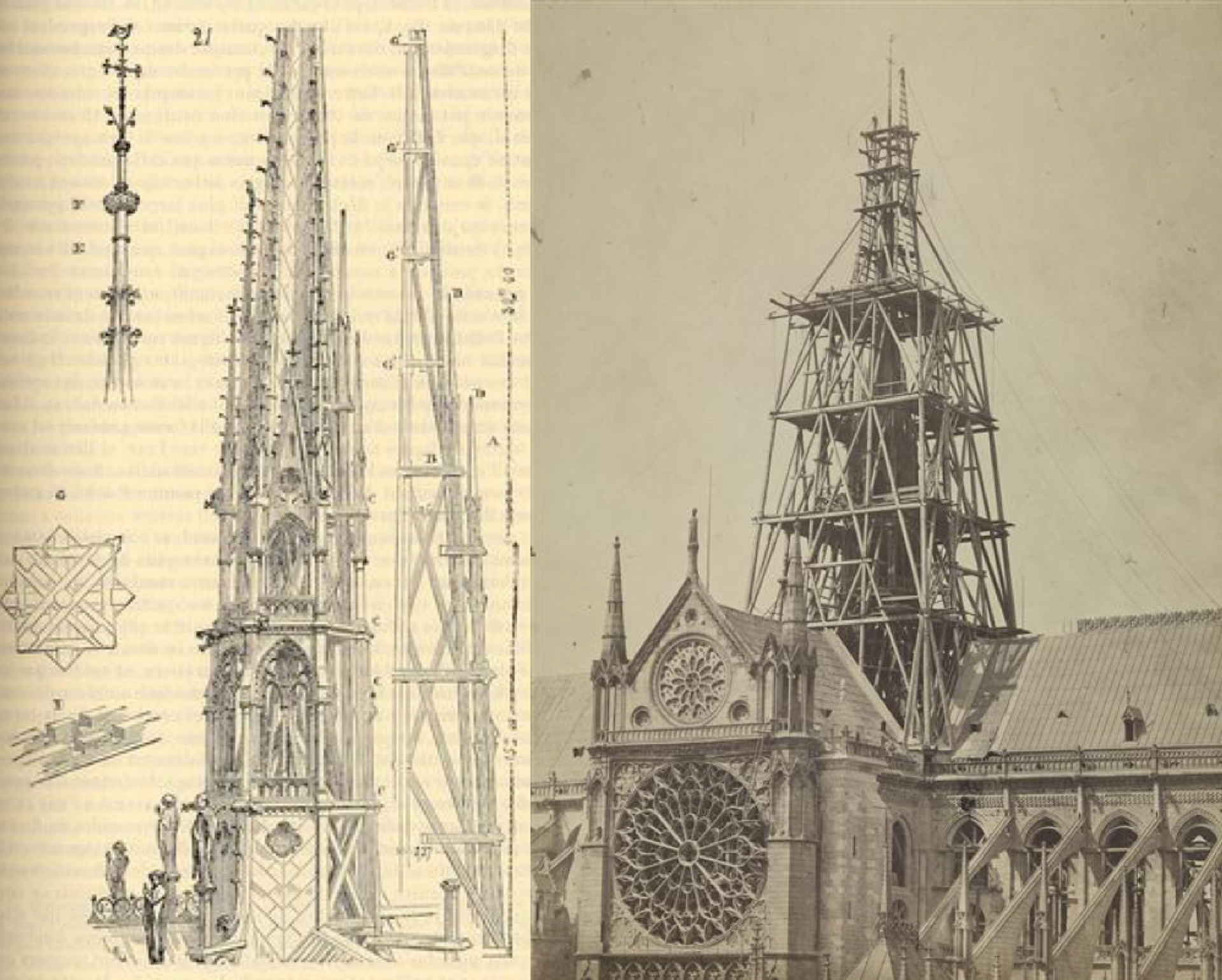 The design of the spire by Viollet-le-Duc, and the spire under construction in the 19th century